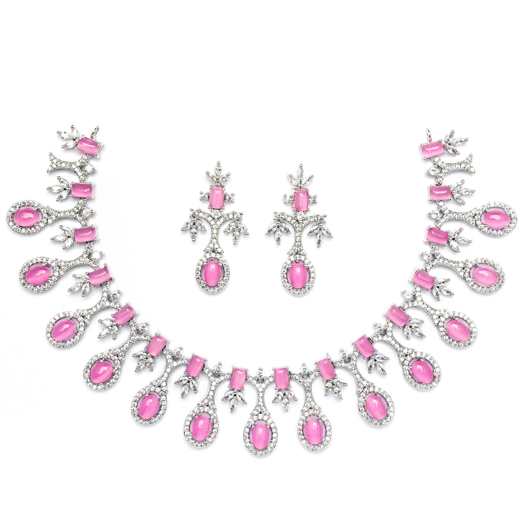 Rhodium-Plated Pink American Diamond Studded Designer Necklace & Earrings Jewellery Set