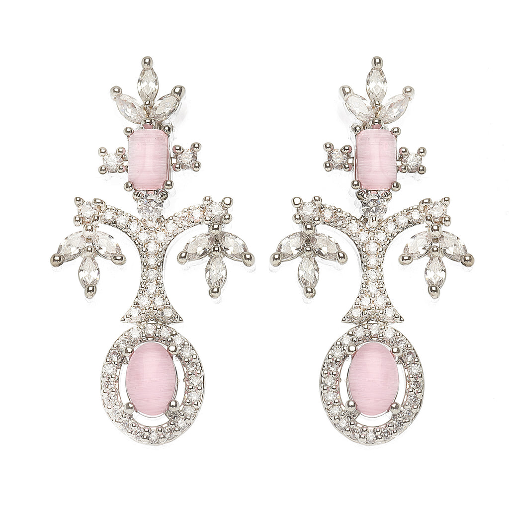 This jewellery set consists of a necklace and a pair of earrings. Rhodium-Plated pink & white american diamond studded designer necklace, secured with hook closure. A pair of matching drop earrings, each secured with a post and back closure.