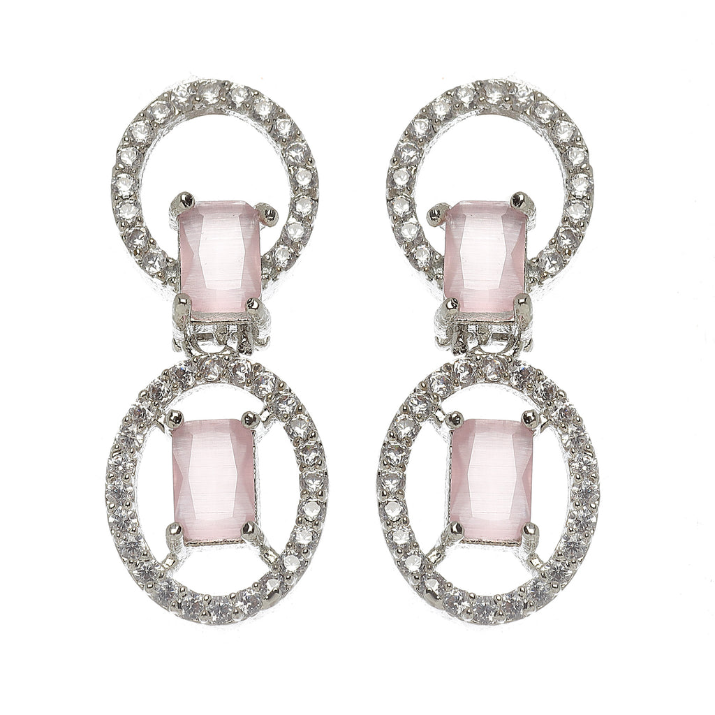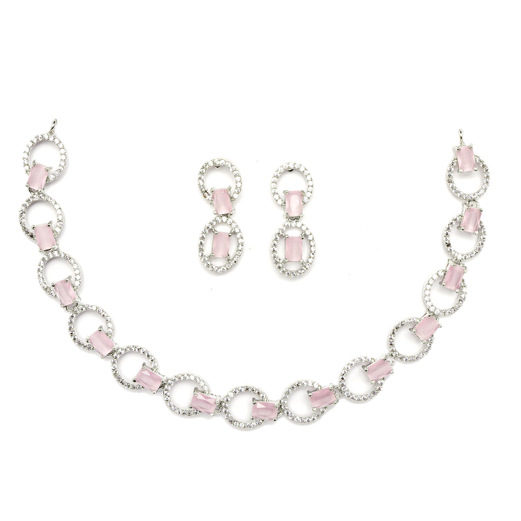 This jewellery set consists of a necklace and a pair of earrings. Rhodium-Plated pink & white american diamond studded disc-shaped necklace, secured with s-hook closure. A pair of matching drop earrings, each secured with a post and back closure.