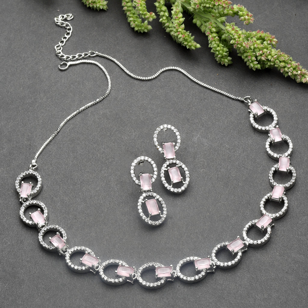 Rhodium-Plated Pink American Diamond Studded Disc-Shaped Necklace & Earrings Jewellery Set