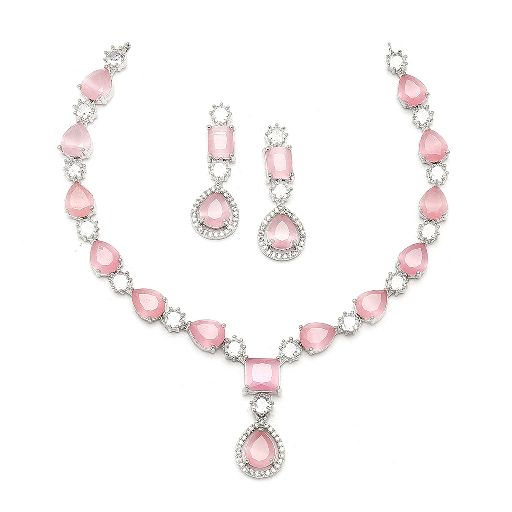 Rhodium-Plated Pink American Diamond Studded Fashionable Necklace & Earrings Jewellery Set