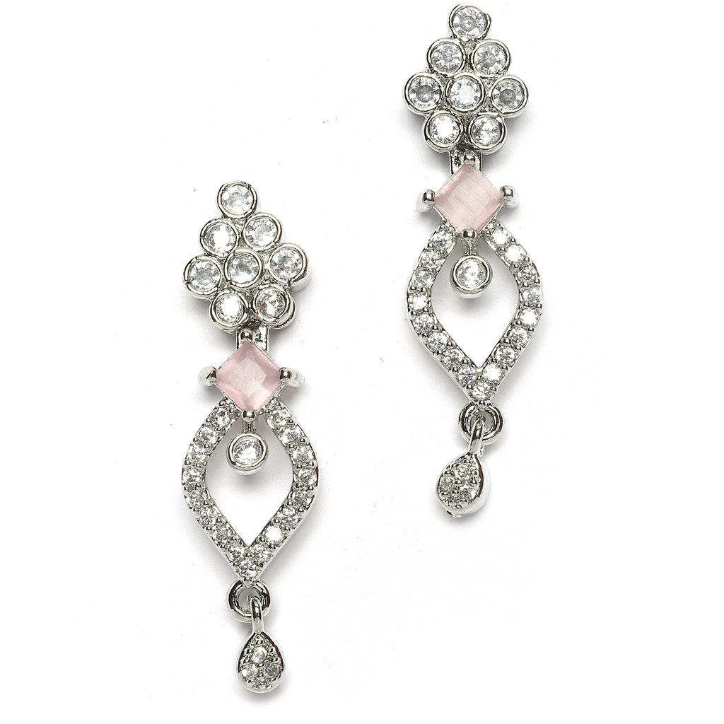This jewellery set consists of a necklace and a pair of earrings. Rhodium-Plated pink & white american diamond studded floral & leaf shaped necklace, has secured with a hook closure. A pair of matching drop earrings, each secured with a post and back closure.