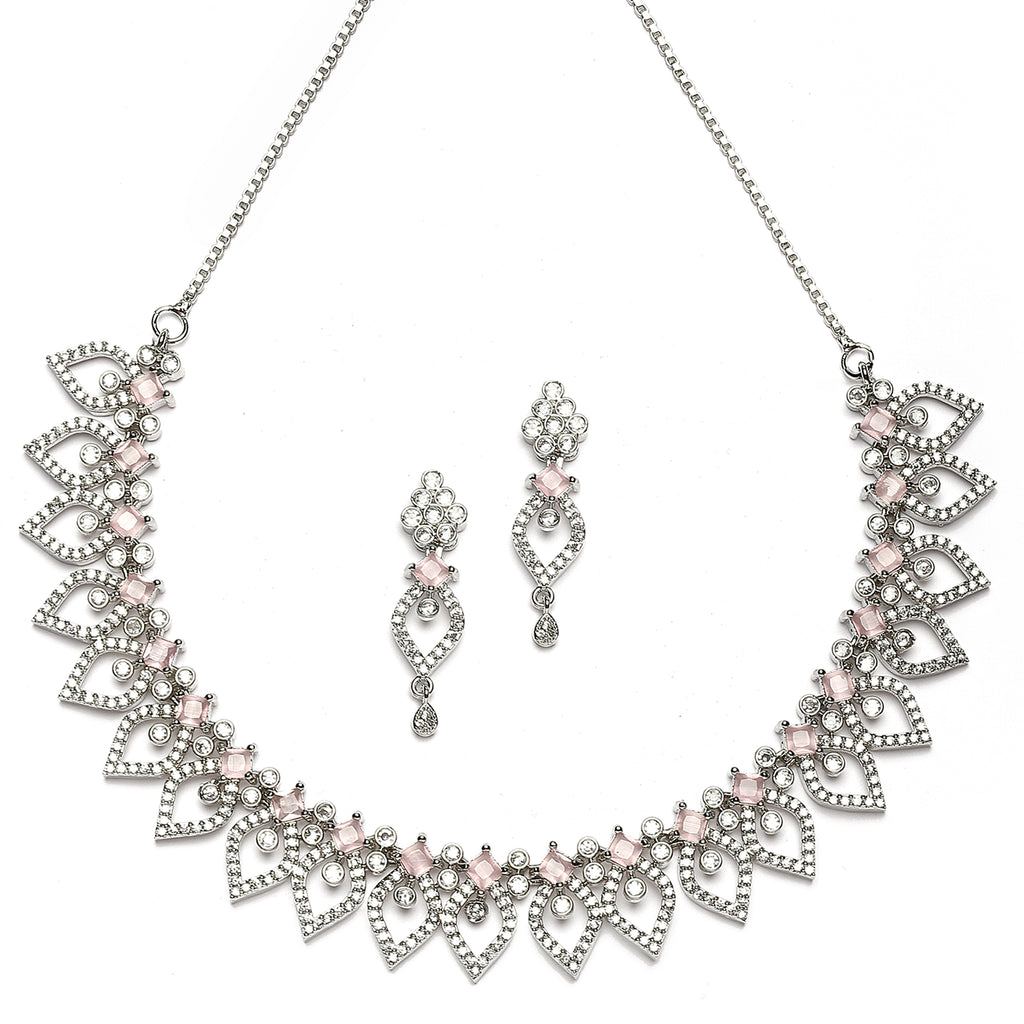 Rhodium-Plated Pink American Diamond Studded Floral & Leaf Shaped Necklace with Earrings Jewellery Set