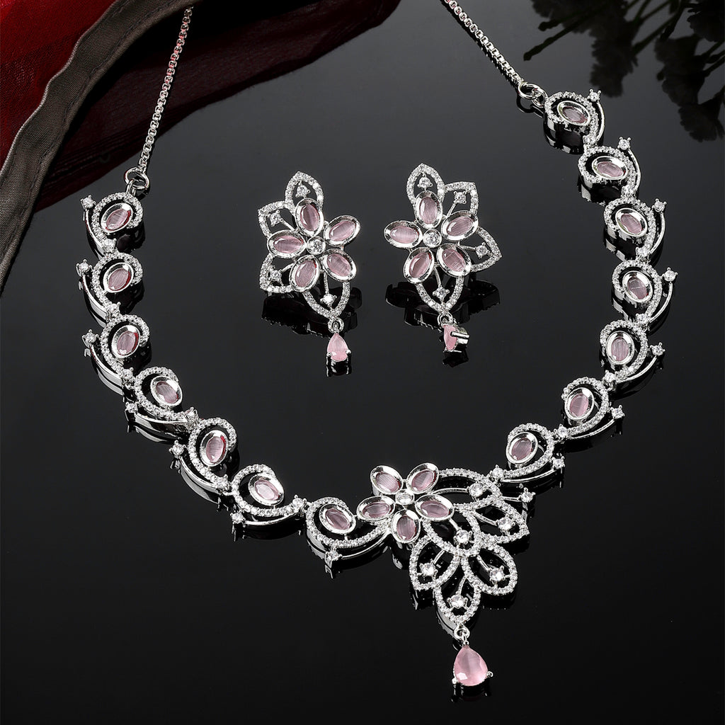 Rhodium-Plated Pink American Diamond Studded Floral & Paisley Shaped Necklace with Earrings Jewellery Set