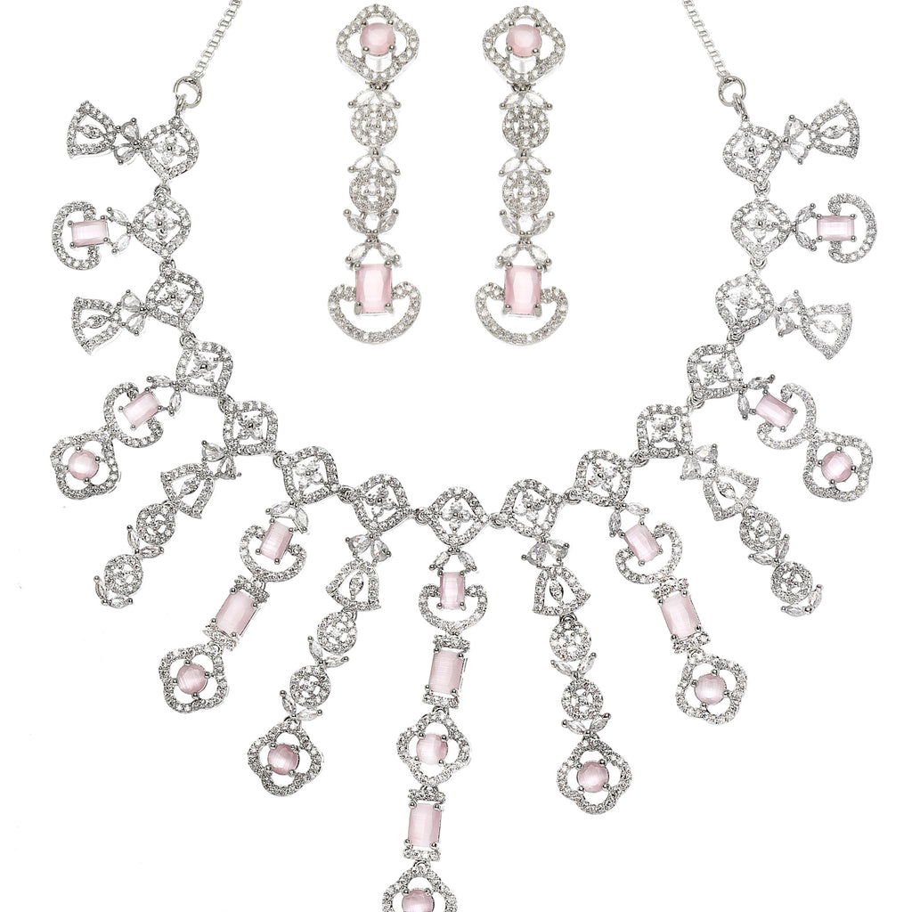 This jewellery set consists of a necklace and a pair of earrings. Rhodium-Plated pink, white american diamond studded floral tasselled necklace, secured with hook closure. A pair of matching drop earrings, each secured with a post and back closure.