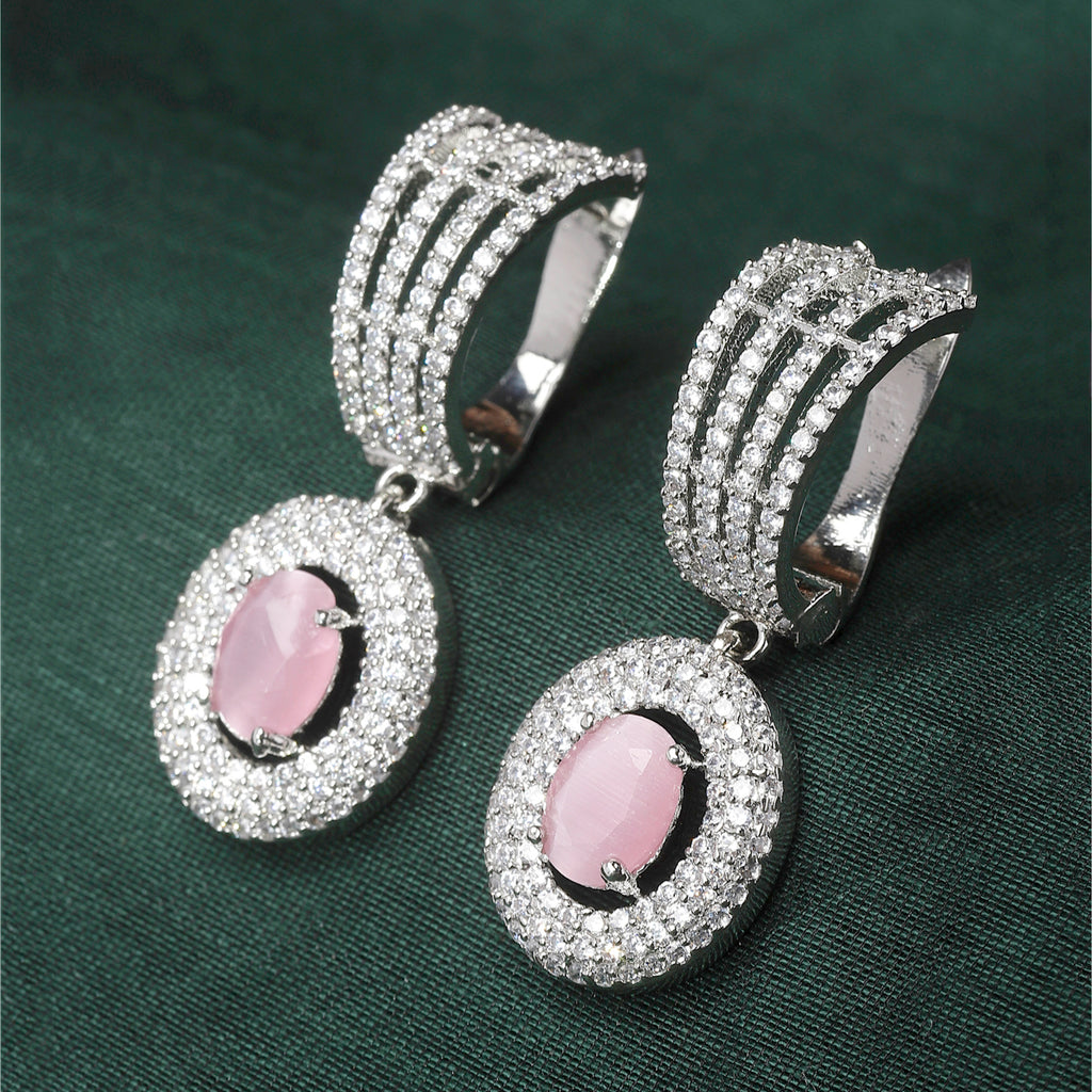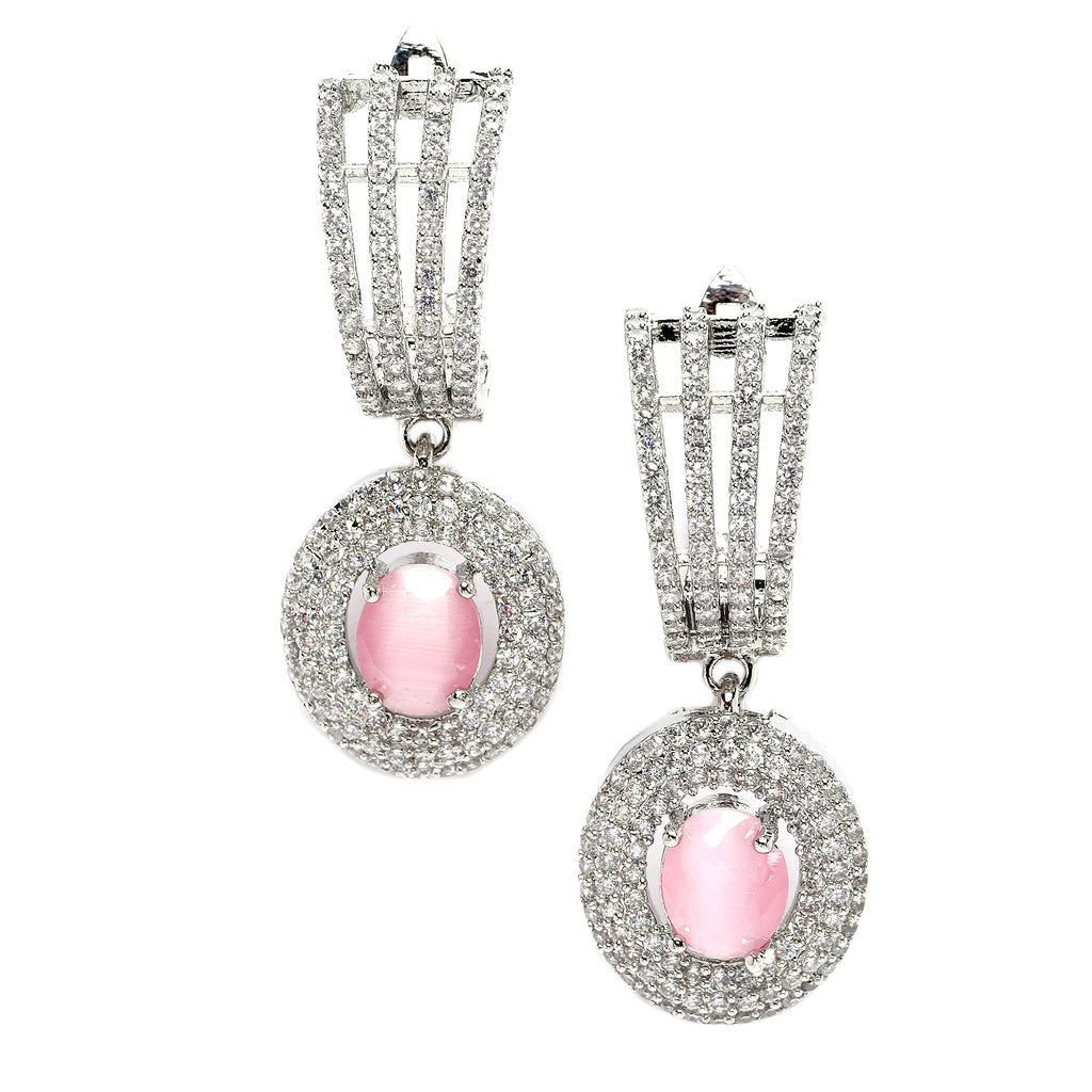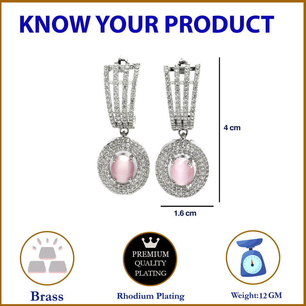 Rhodium-Plated with Silver-Toned Pink and White Handcrafted Oval Shaped Drop Earrings, has American Diamond studded secured with a lever back.