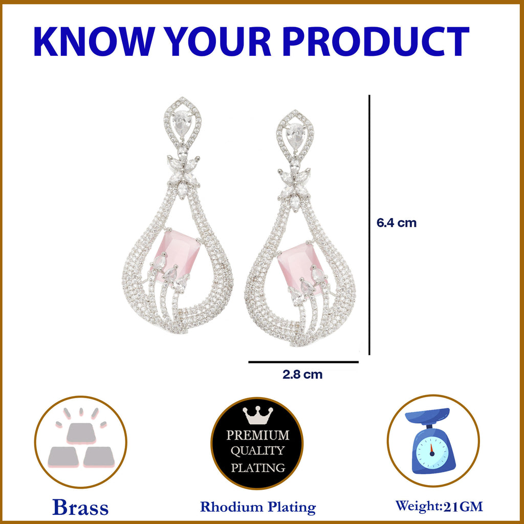 Rhodium-Plated with Silver-Toned Pink & White Handcrafted Quirky Shaped Drop Earrings, has American Diamond studded secured with a post and back.