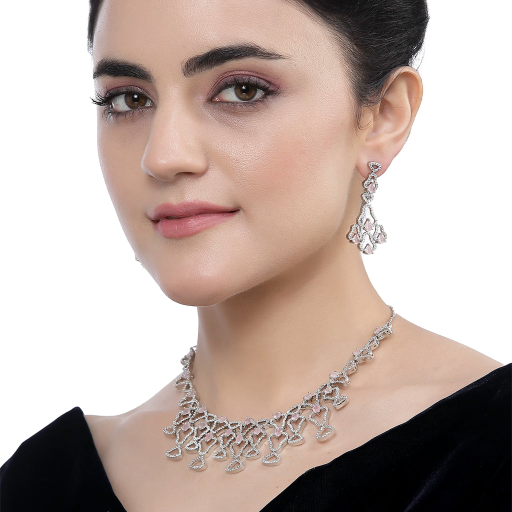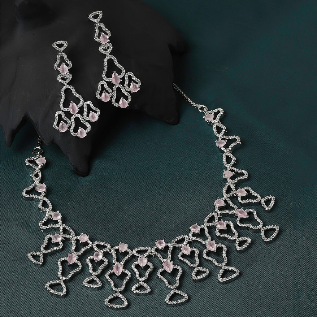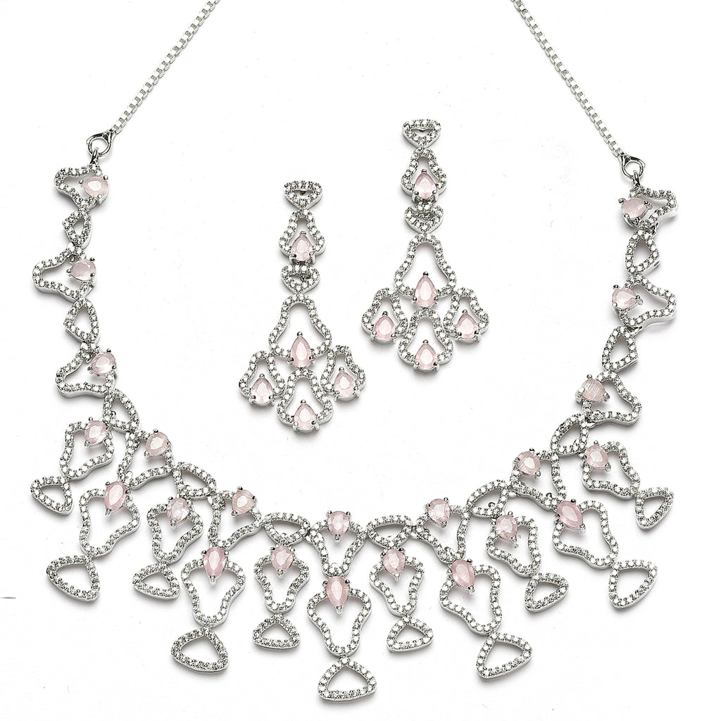 Rhodium-Plated Pink American Diamond Studded Quirky Design Necklace with Earrings Jewellery Set