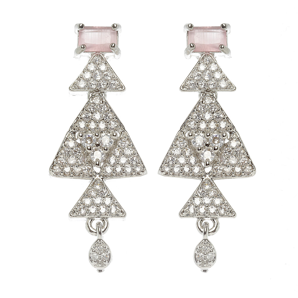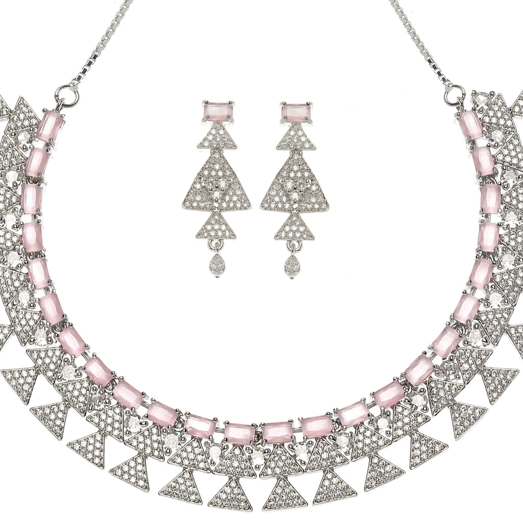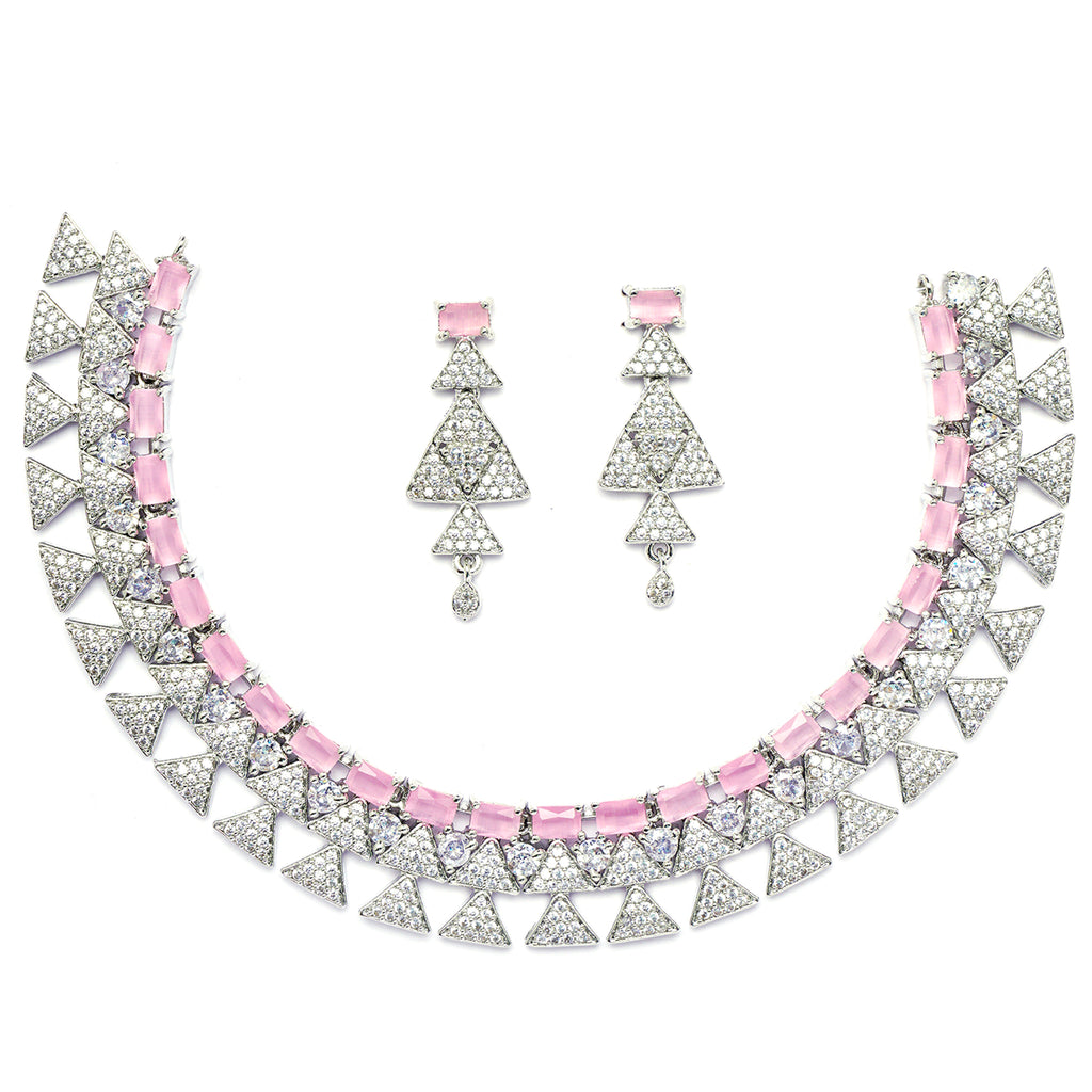 Rhodium-Plated Pink American Diamond Studded Triangular Design Necklace & Earrings Jewellery Set