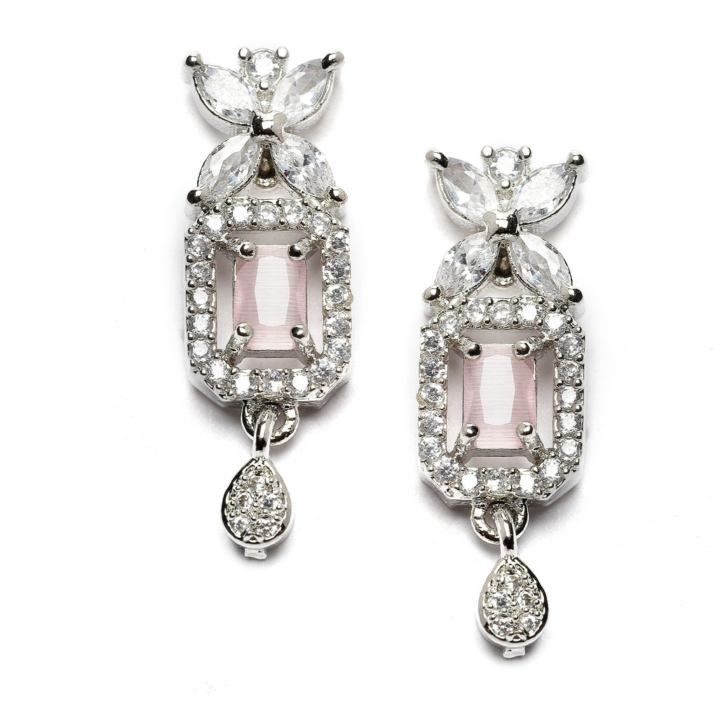This jewellery set consists of a necklace and a pair of earrings. Rhodium-Plated pink & white american diamonds studded cubical necklace, secured with hook closure. A pair of matching drop earrings, each secured with a post and back closure.