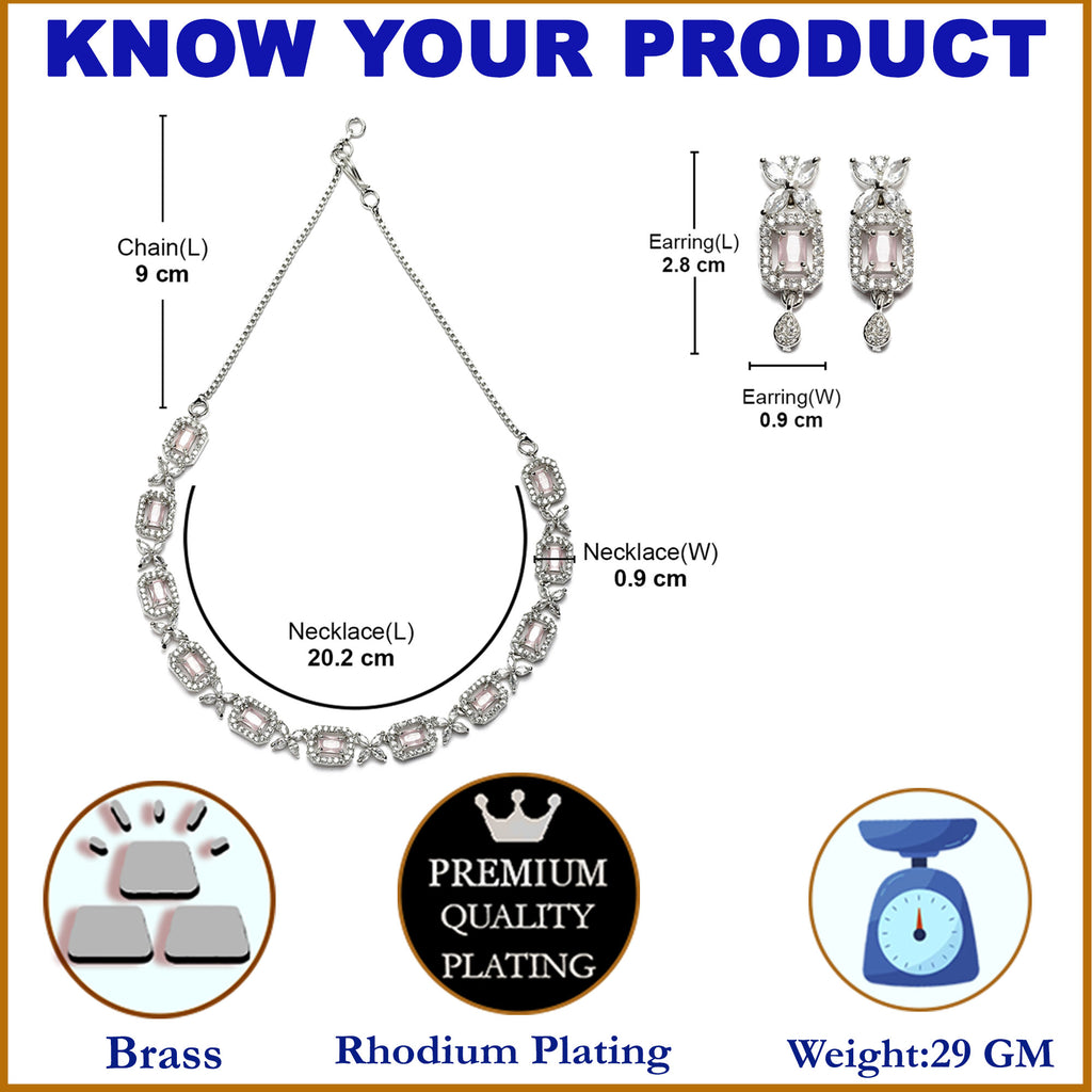 Rhodium-Plated Pink American Diamonds Studded Cubical Necklace & Earrings Jewellery Set