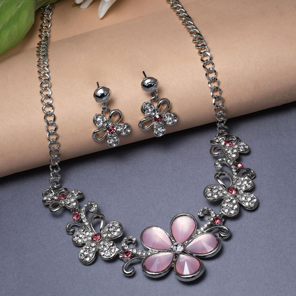 Rhodium-Plated Pink American Diamonds Studded Floweret Necklace & Earrings Jewellery Set