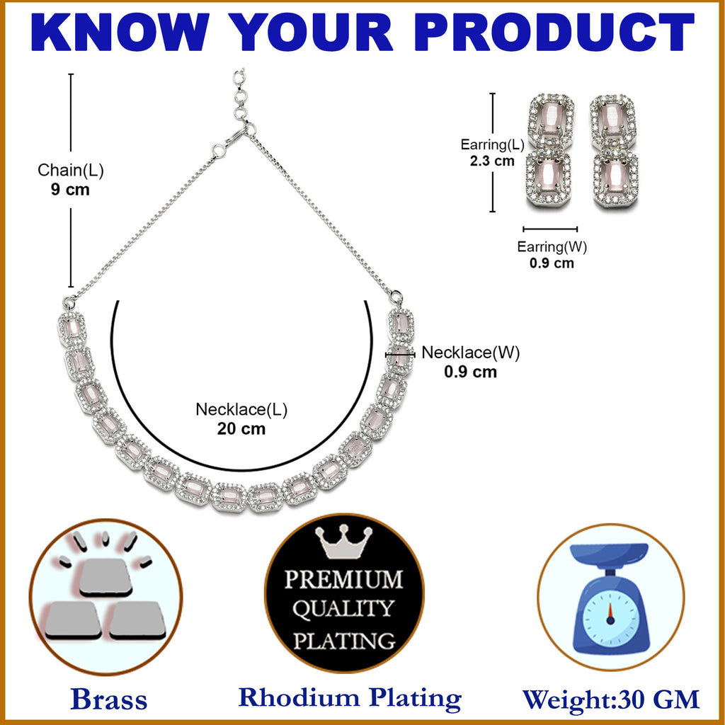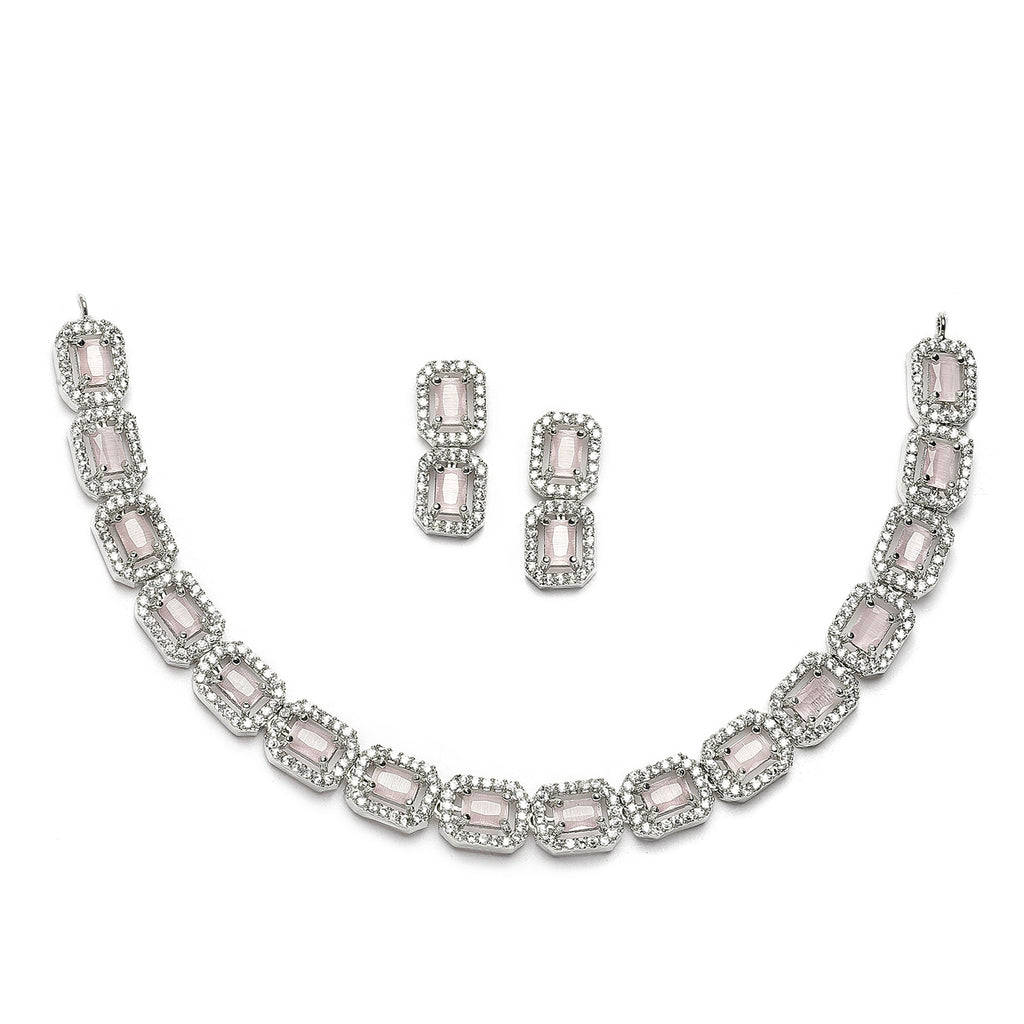 Rhodium-Plated Pink American Diamonds Studded Quadrate Shaped Necklace & Earrings Jewellery Set
