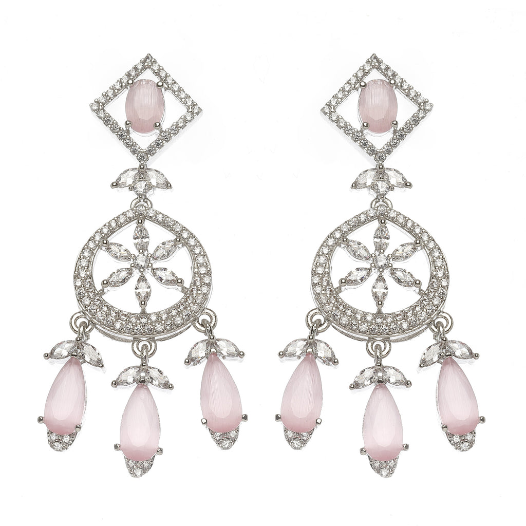 This jewellery set consists of a necklace and a pair of earrings. Rhodium-Plated pink & white baguette teardrops american diamond studded necklace, secured with hook closure. A pair of matching drop earrings, each secured with a post and back closure.