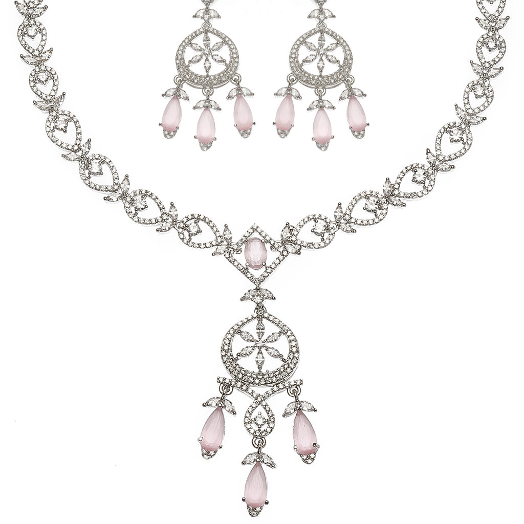 Rhodium-Plated Pink Baguette Teardrops American Diamonds Studded Necklace & Earrings Jewellery Set