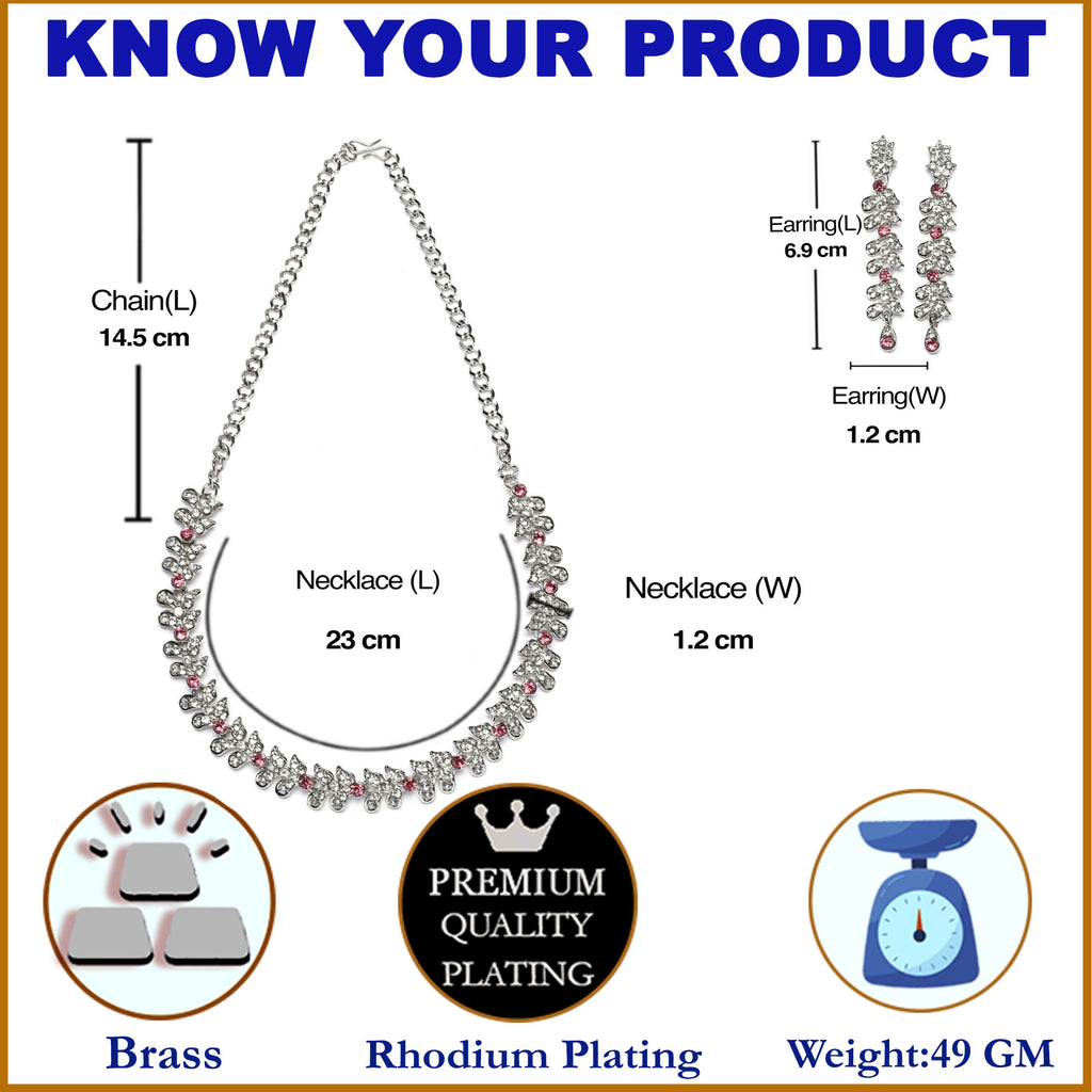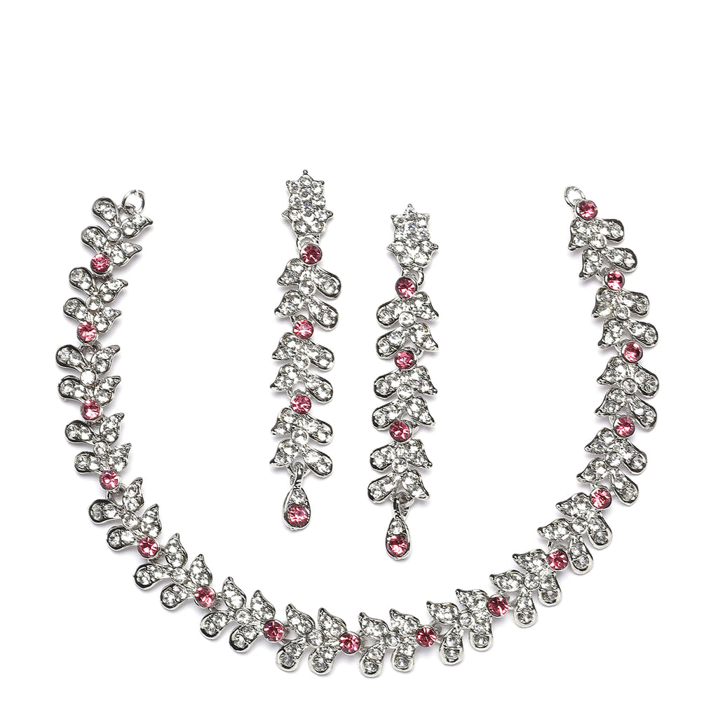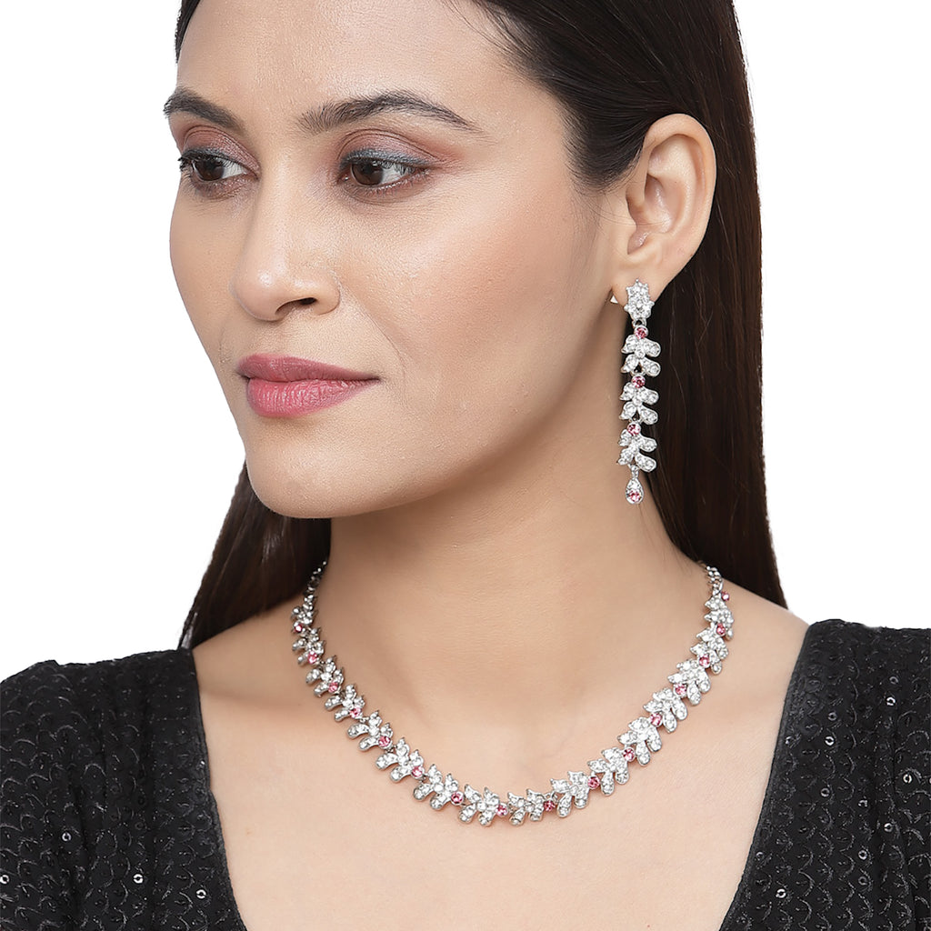 Rhodium-Plated Pink Cubic Zirconia Studded Leafy Shaped Necklace with Earrings Jewellery Set