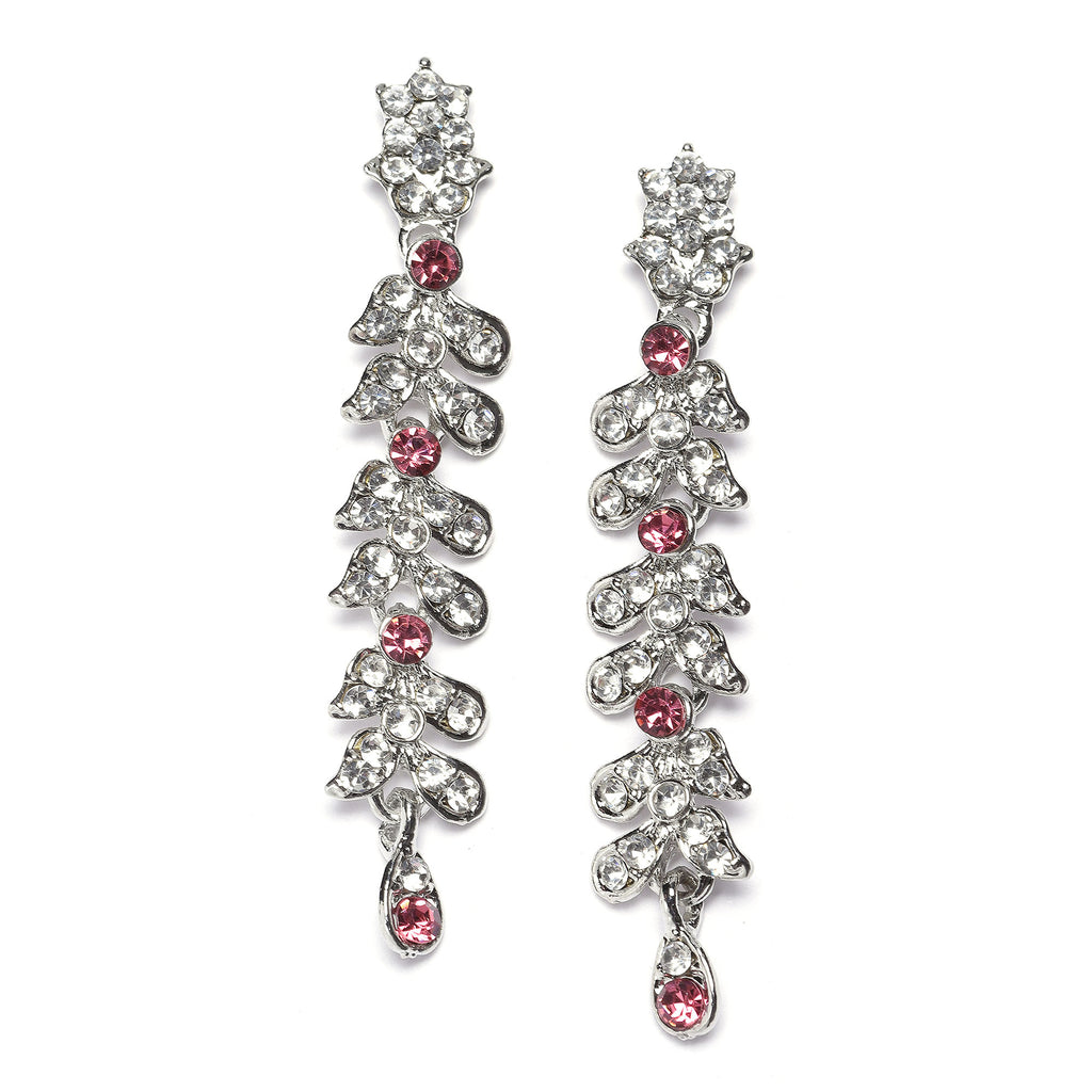 This jewellery set consists of a necklace and a pair of earrings. Rhodium-Plated pink & white cubic zirconia studded leafy shaped necklace, secured with s-hook closure. A pair of matching drop earrings, each secured with a post and back closure.