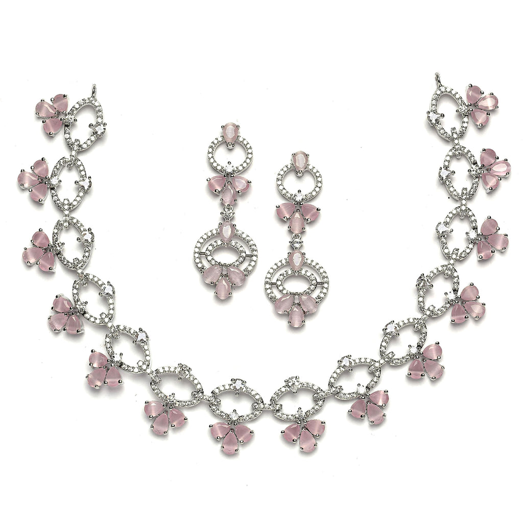 Rhodium-Plated Pink Oval American Diamond Studded Circular Shaped Necklace & Earrings Jewellery Set