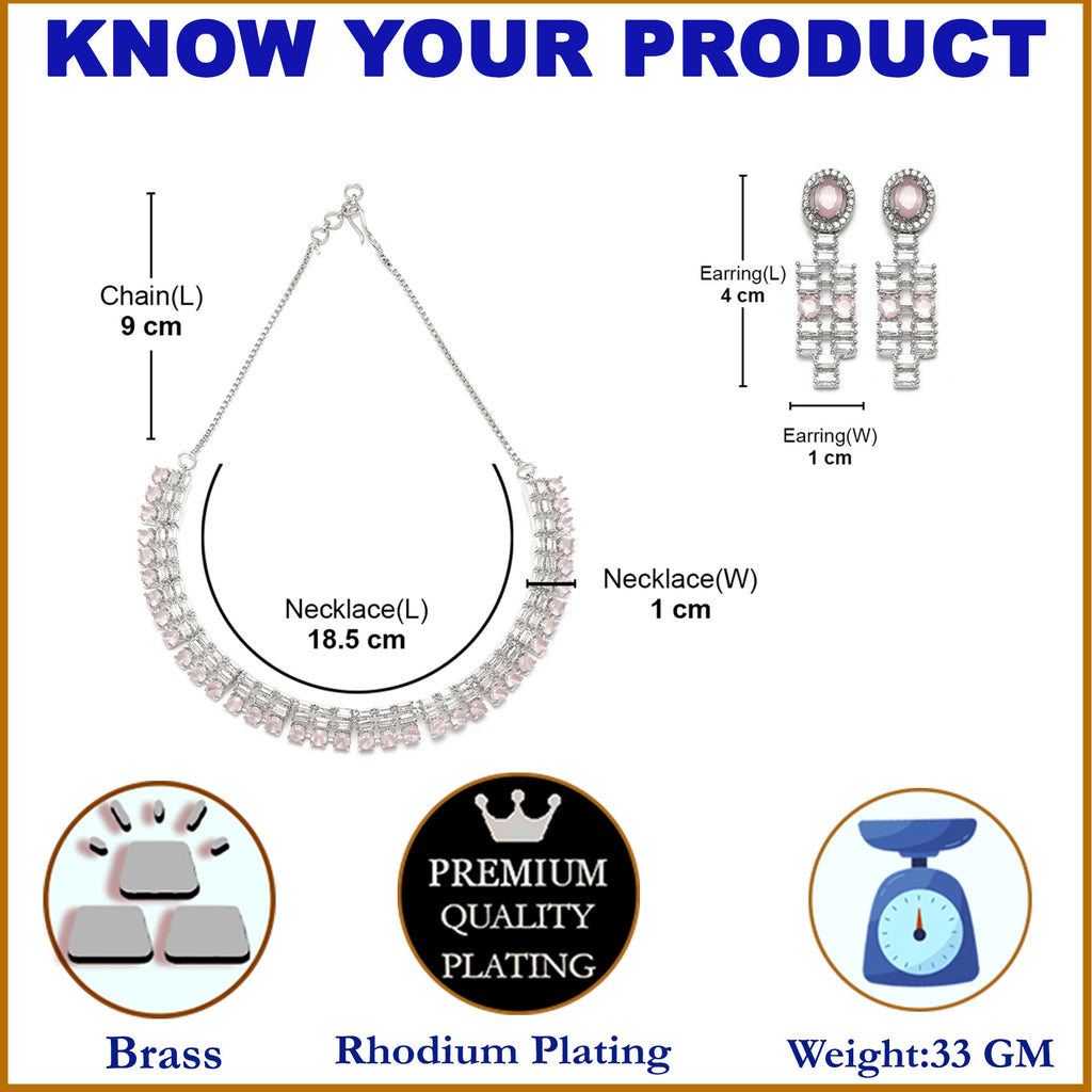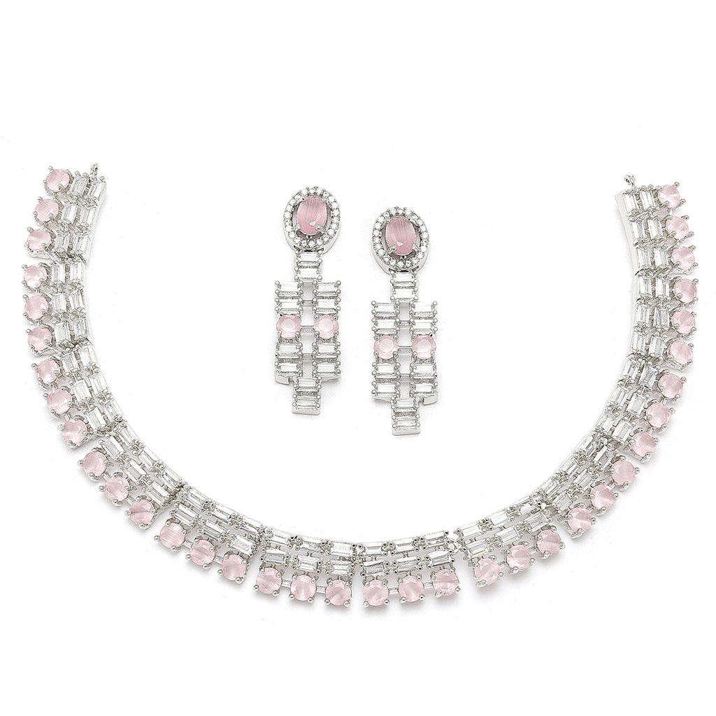 Rhodium-Plated Pink Round Shape American Diamonds Studded Necklace & Earrings Jewellery Set