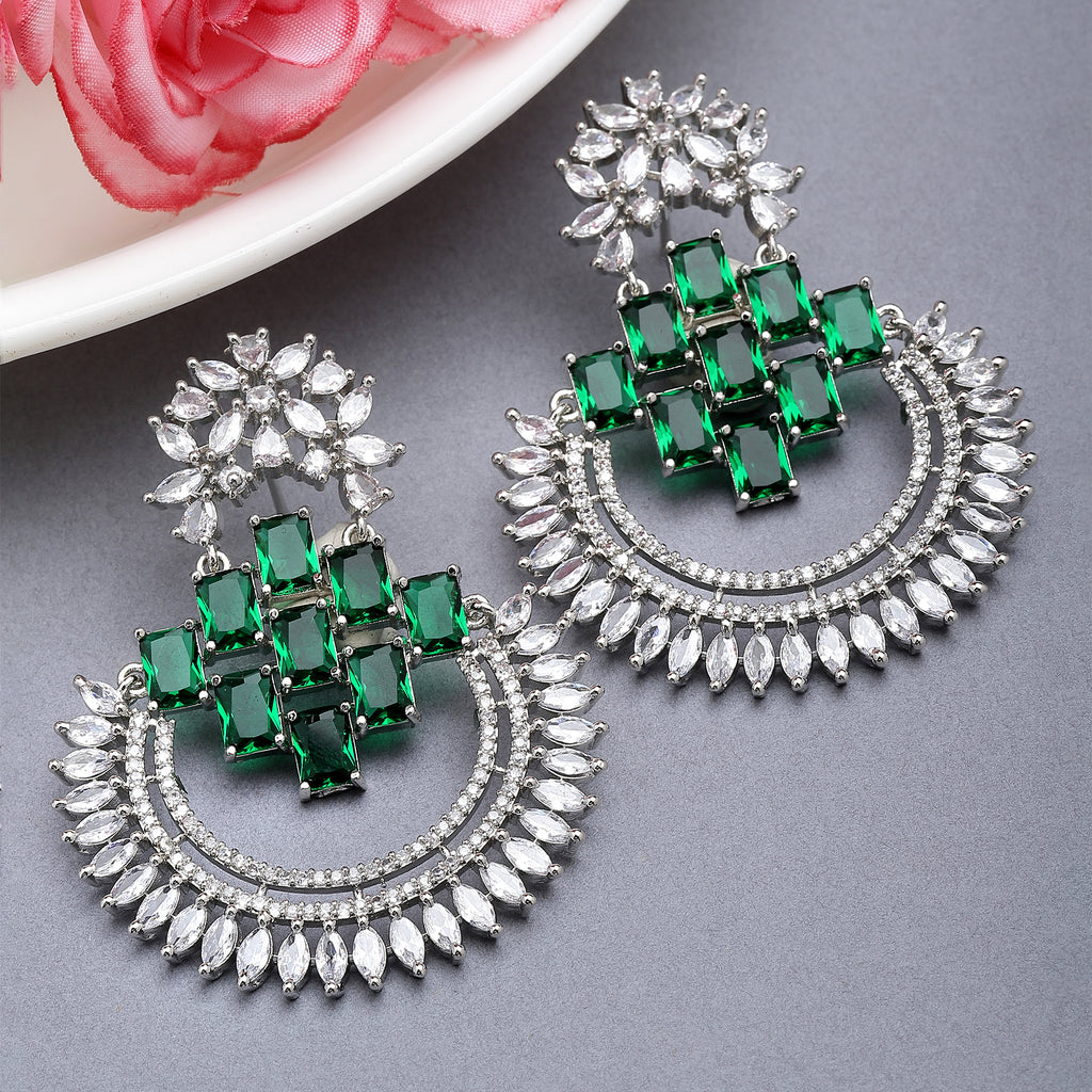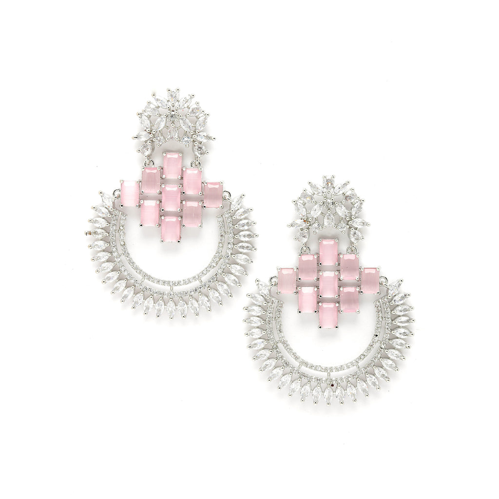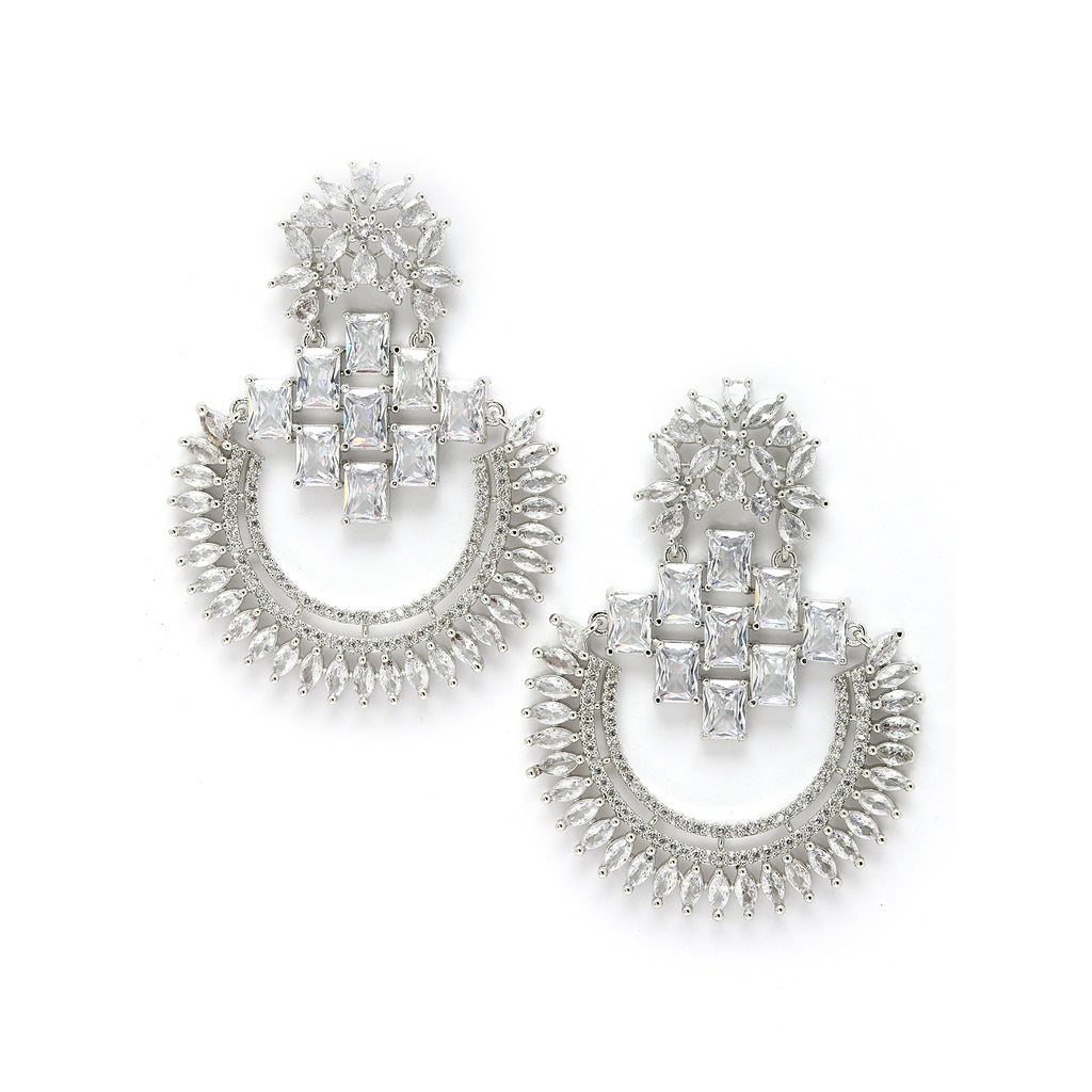 Rhodium-Plated with Silver-Toned chandbali drop earrings, has American Diamond studded secured with a post and back.