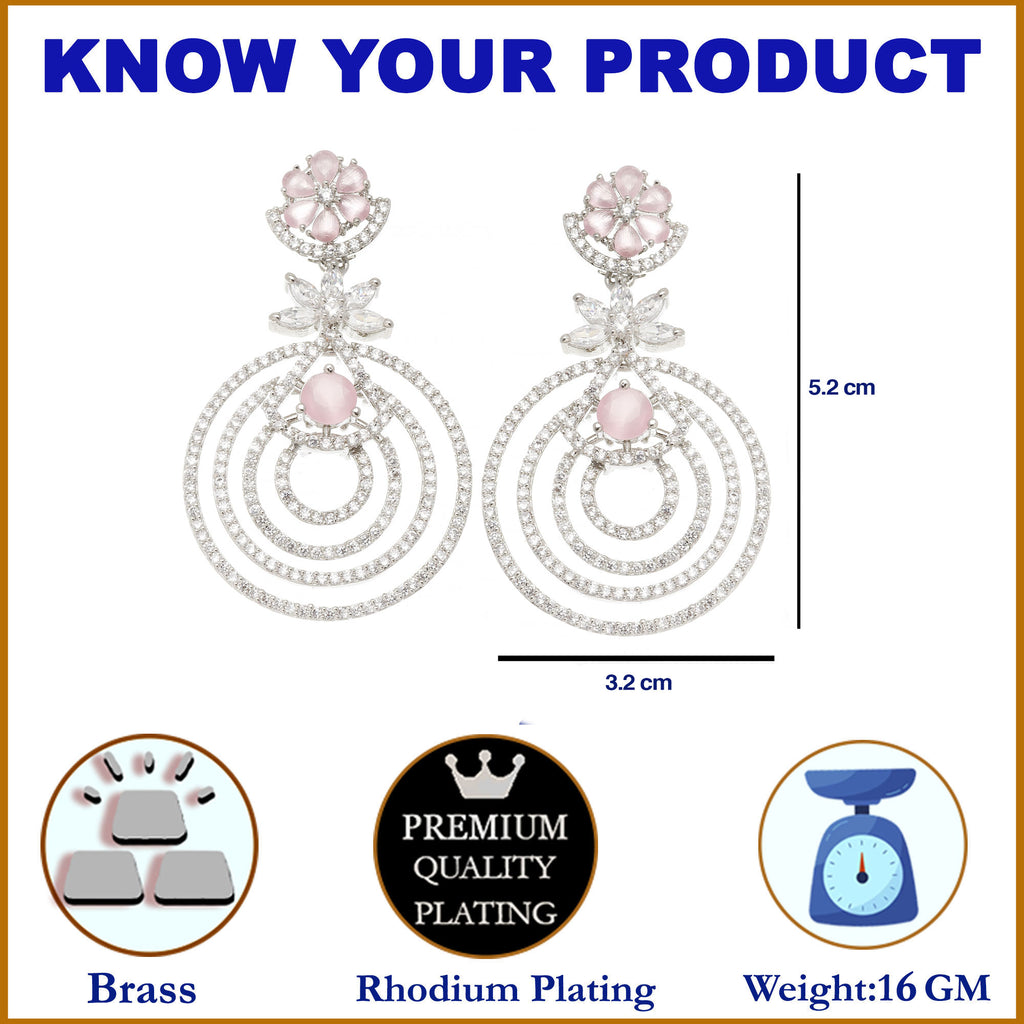 Rhodium-Plated Pink & White American Diamond studded Floral & Circular Layered Drop Earrings