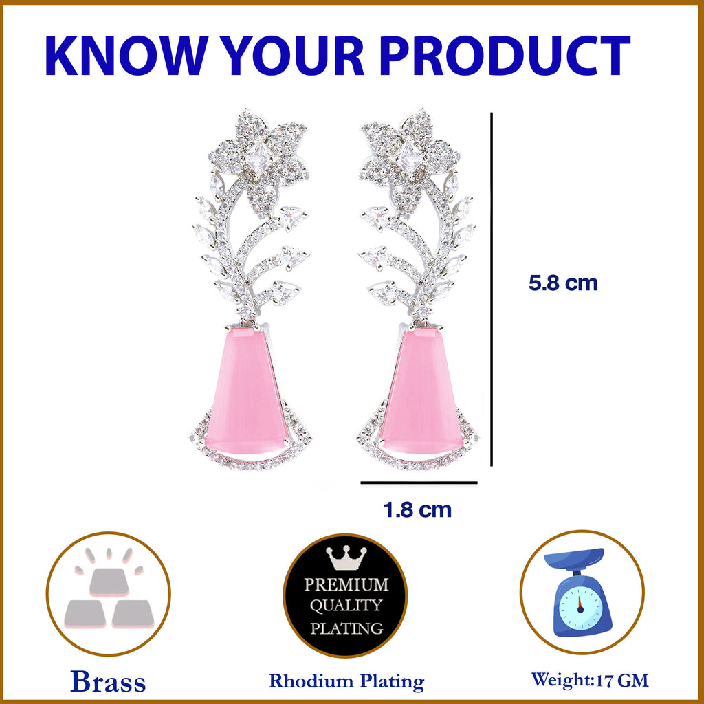 Rhodium-Plated with Silver-Toned Pink & White Floral Theme Drop Earrings, has American Diamond studded secured with a post and back.