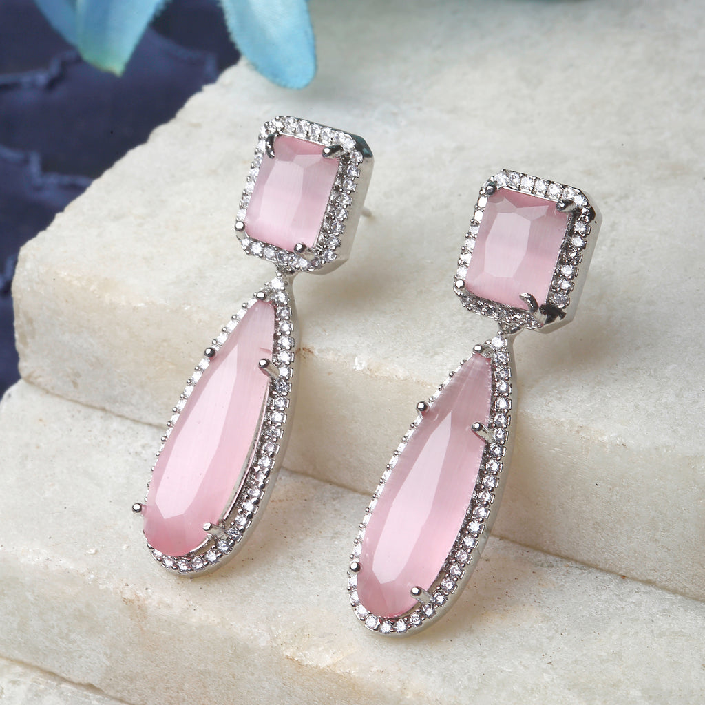 Rhodium-Plated Pink & White Teardrop Shaped Drop Earrings, has American Diamond studded secured with a post and back.