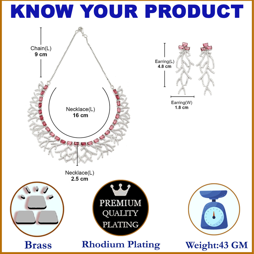 Rhodium-Plated Red American Diamond Studded Eccentric Design Necklace & Earrings Jewellery Set