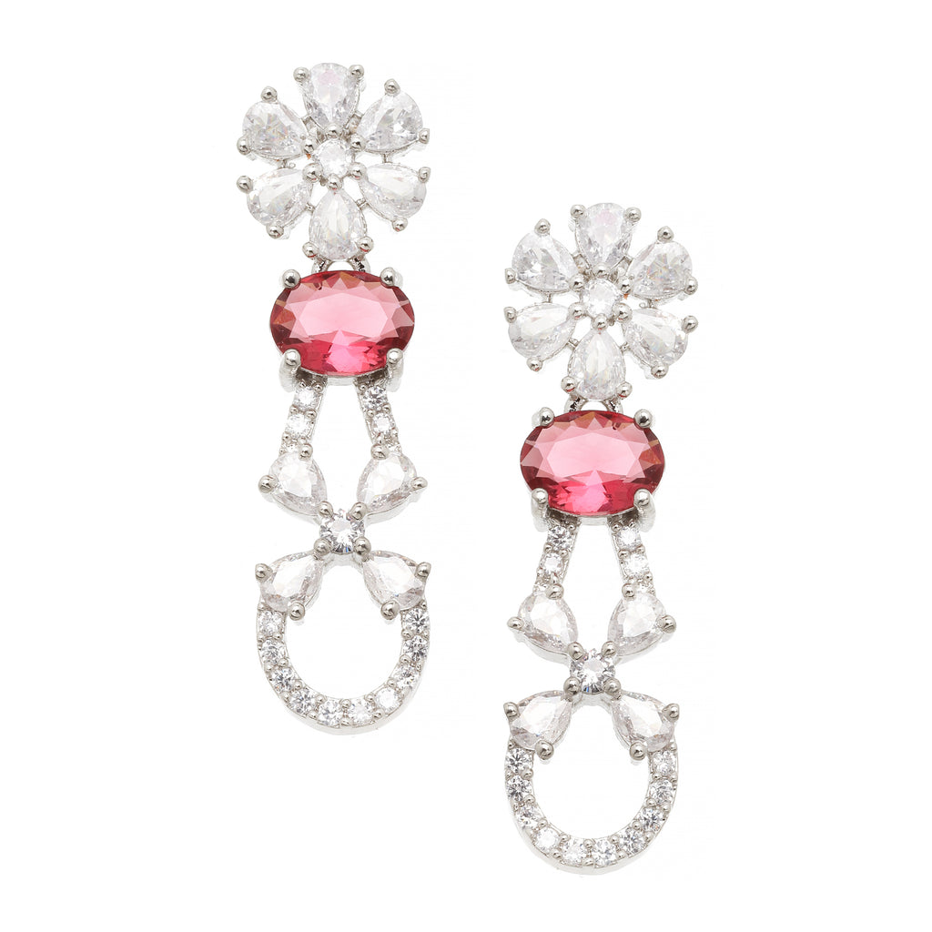 Rhodium-Plated Red American Diamond studded Floral Shaped Drop Earrings