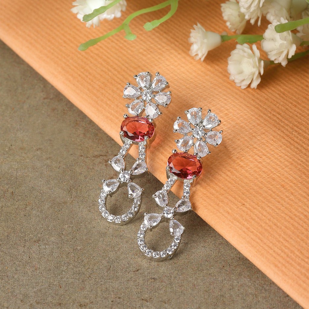 Rhodium-Plated with Silver-Toned Red and White Floral Shaped Drop Earrings, has American Diamond studded secured with a post and back.