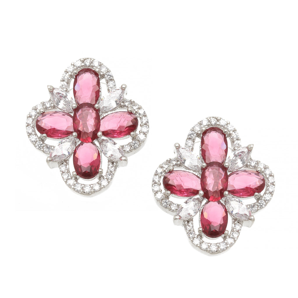 Rhodium-Plated Red American Diamond studded Floral Shaped Stud Earrings