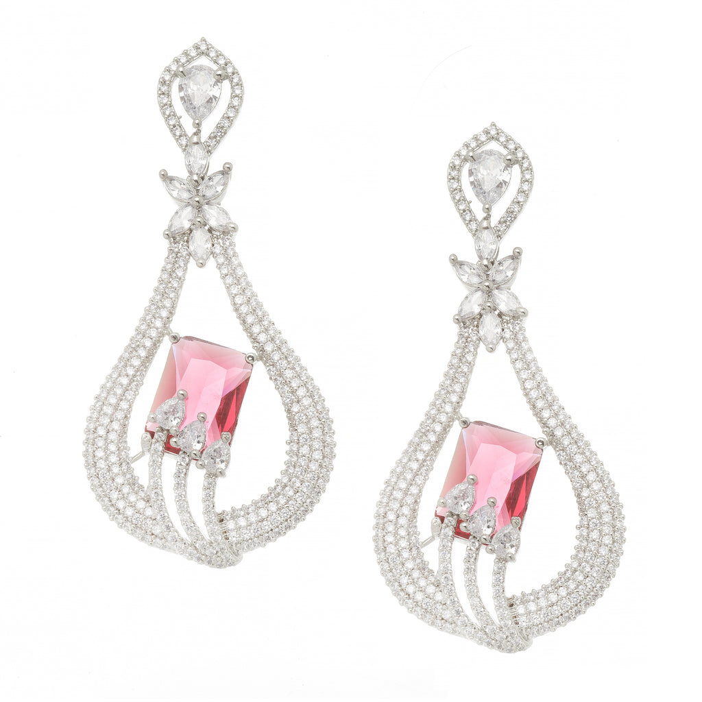 Rhodium-Plated Red American Diamond studded Handcrafted Quirky Shaped Drop Earrings