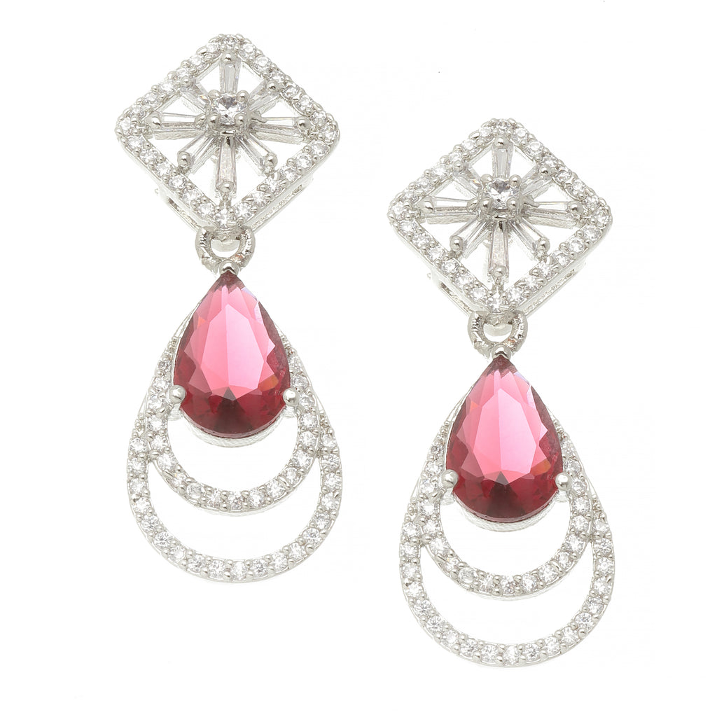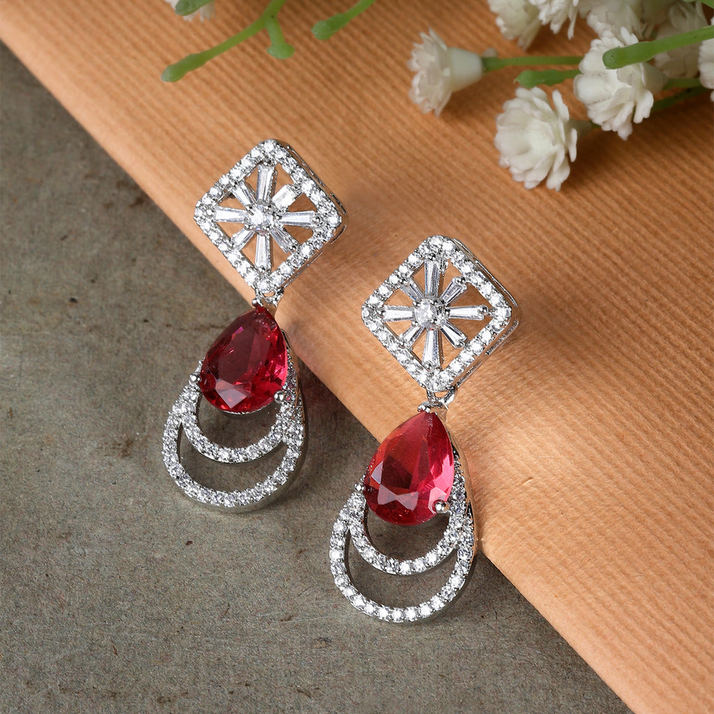 Rhodium-Plated Red American Diamond studded Handcrafted Teardrop Layered Drop Earrings
