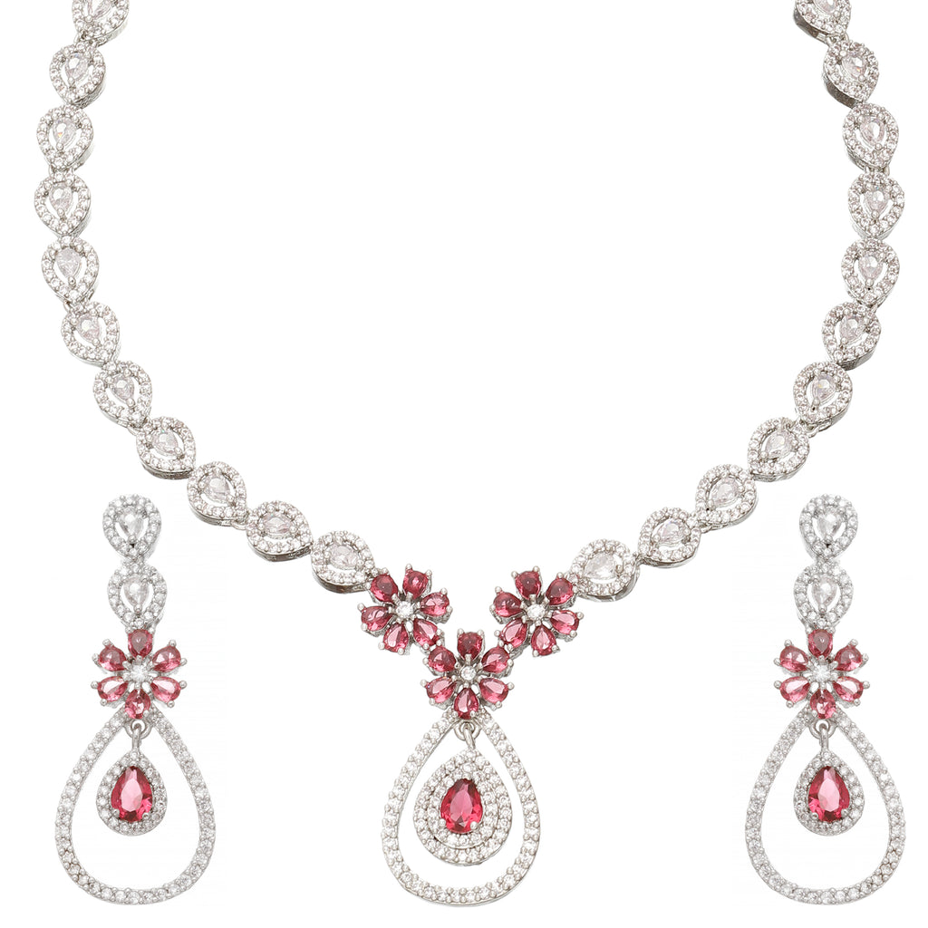 Rhodium-Plated Red American Diamond Studded Teardrop & Floral Shaped Jewellery Set