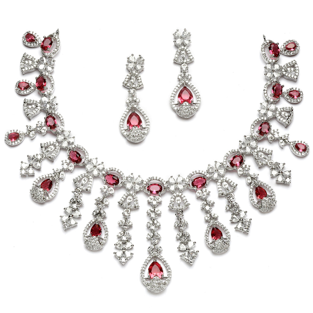 Rhodium-Plated Red American Diamond Studded Teardrop Tasselled Necklace & Earrings Jewellery Set