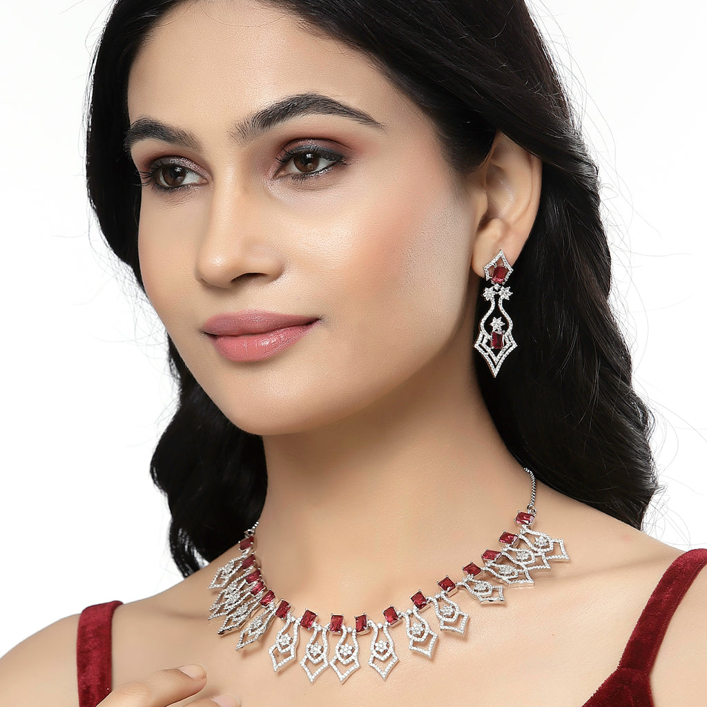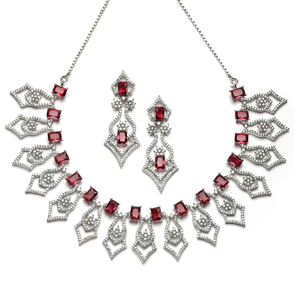 Rhodium-Plated Red American Diamond Studded Tempted Necklace & Earrings Jewellery Set