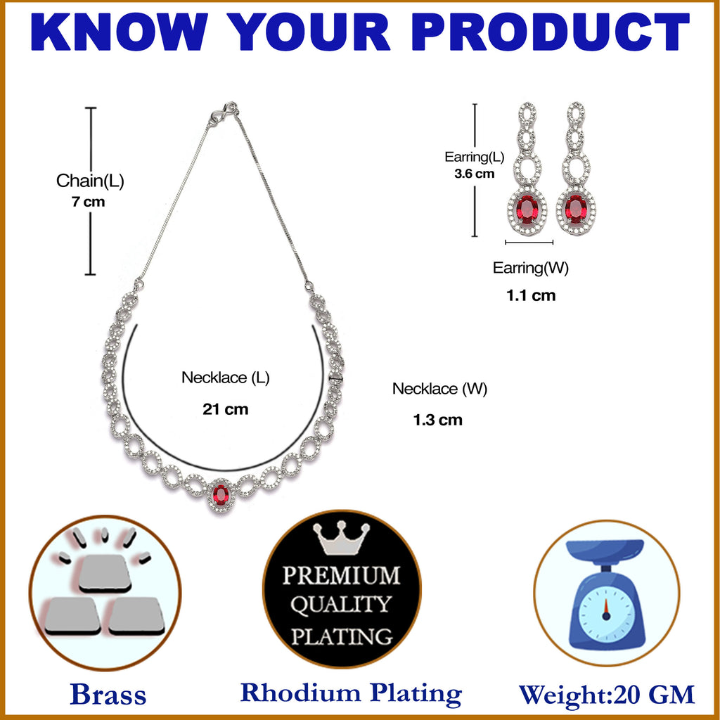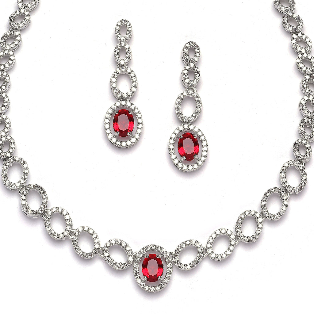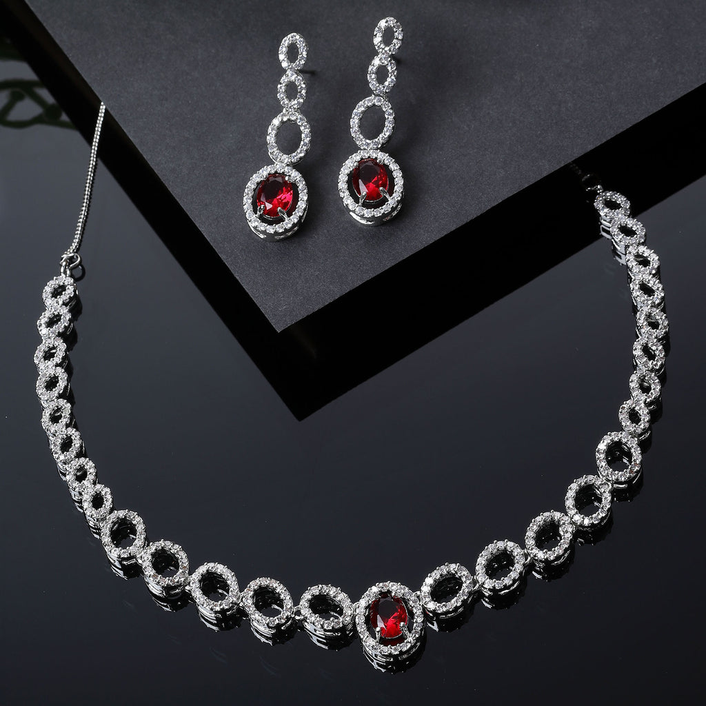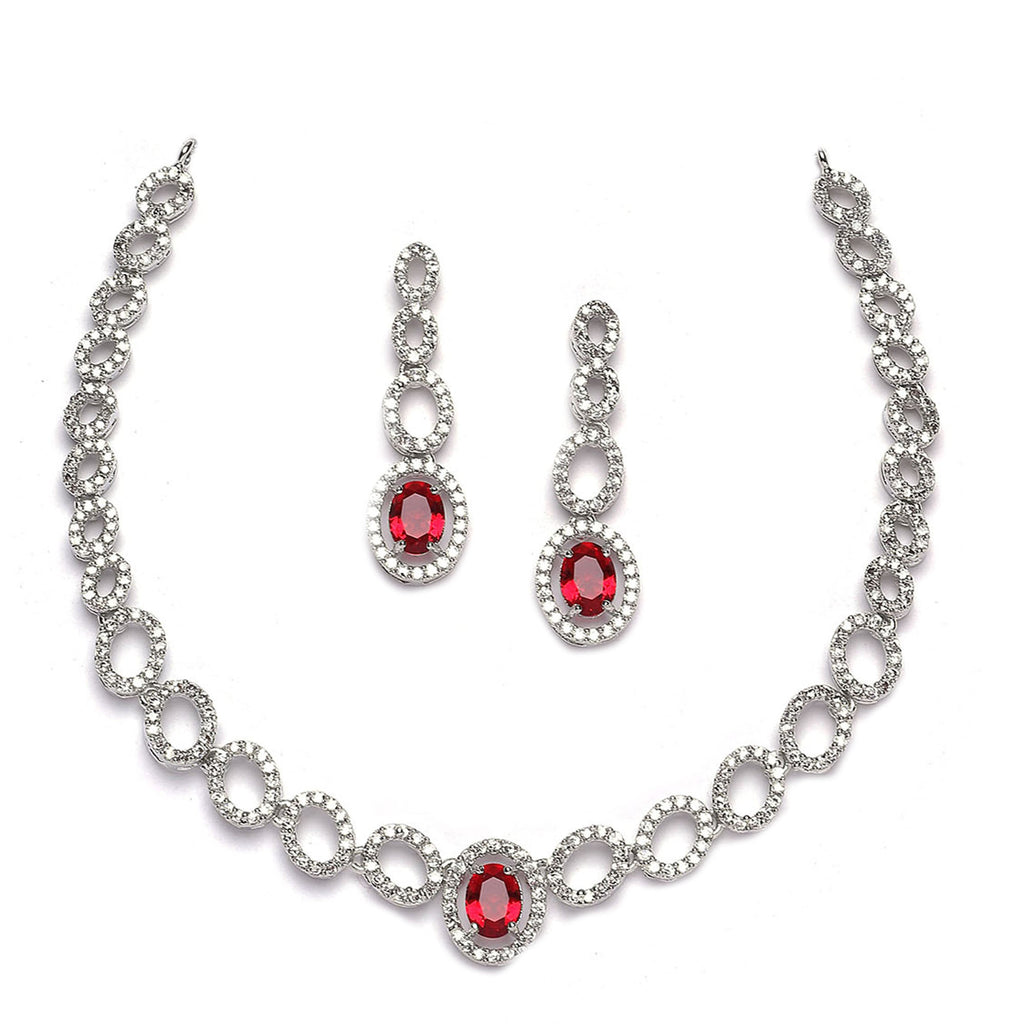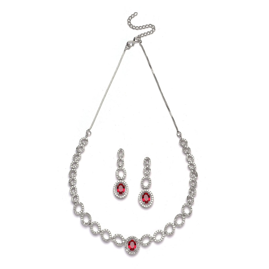 Rhodium-Plated Red American Diamonds Studded Ovate Shaped Necklace & Earrings Jewellery Set
