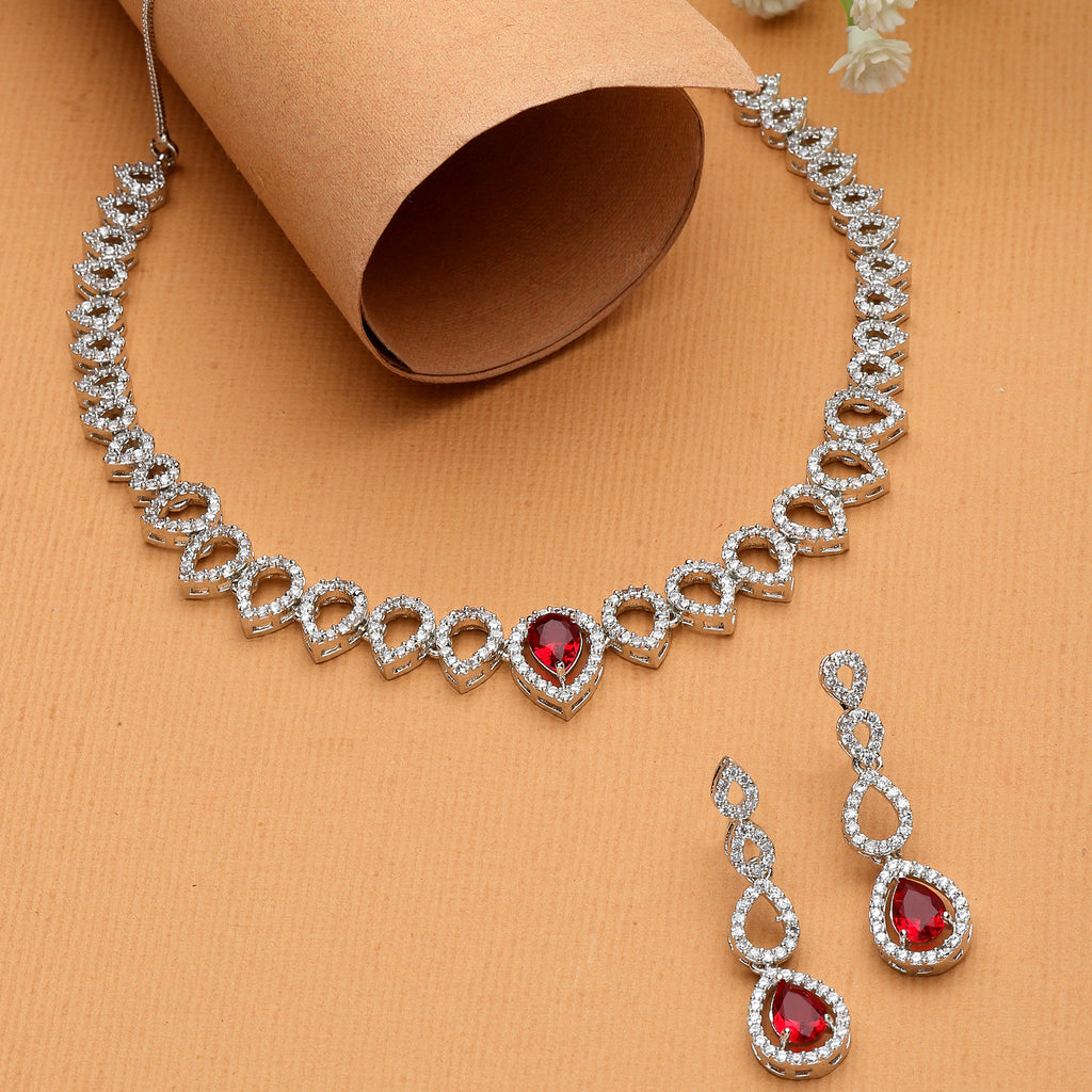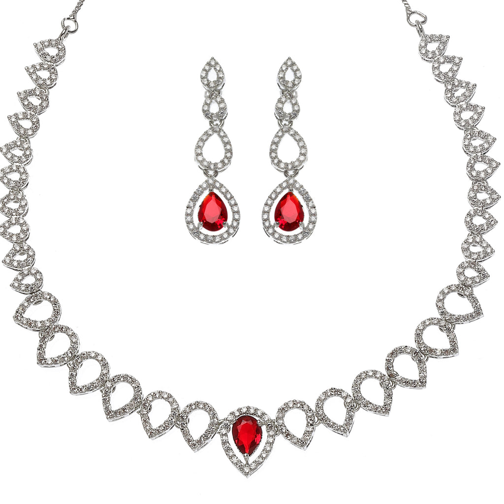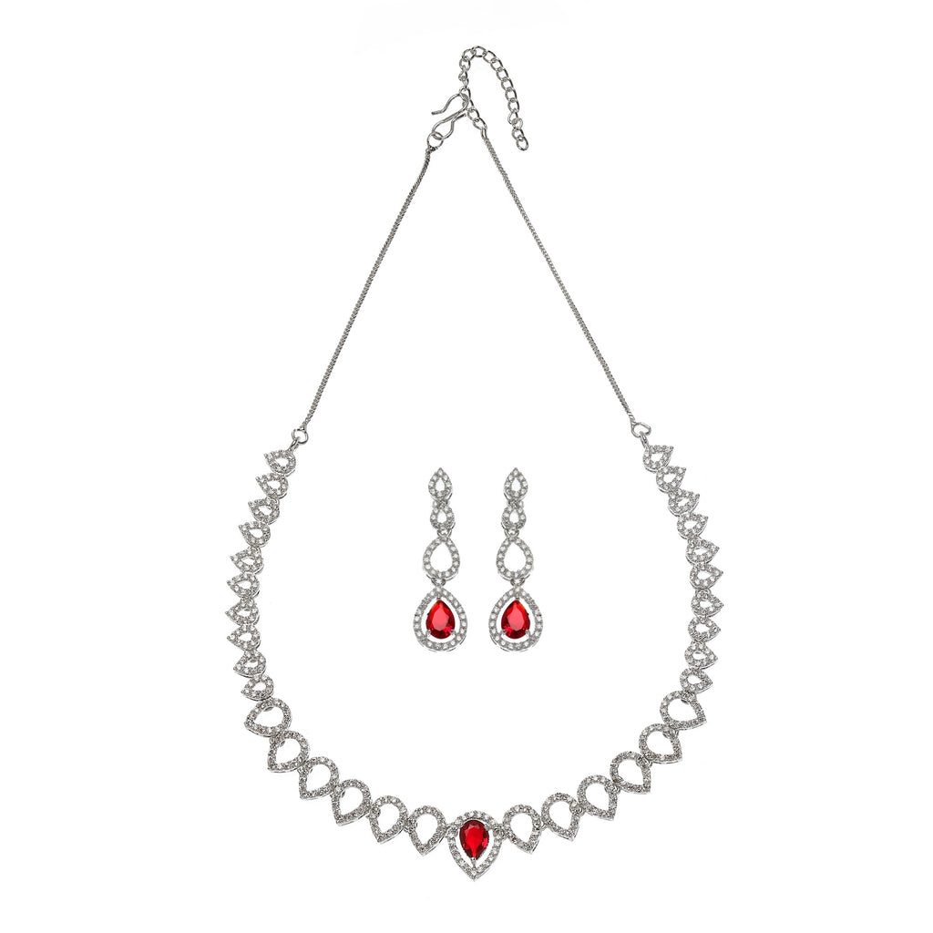 Rhodium-Plated Red American Diamonds Studded Spheroid Necklace & Earrings Jewellery Set
