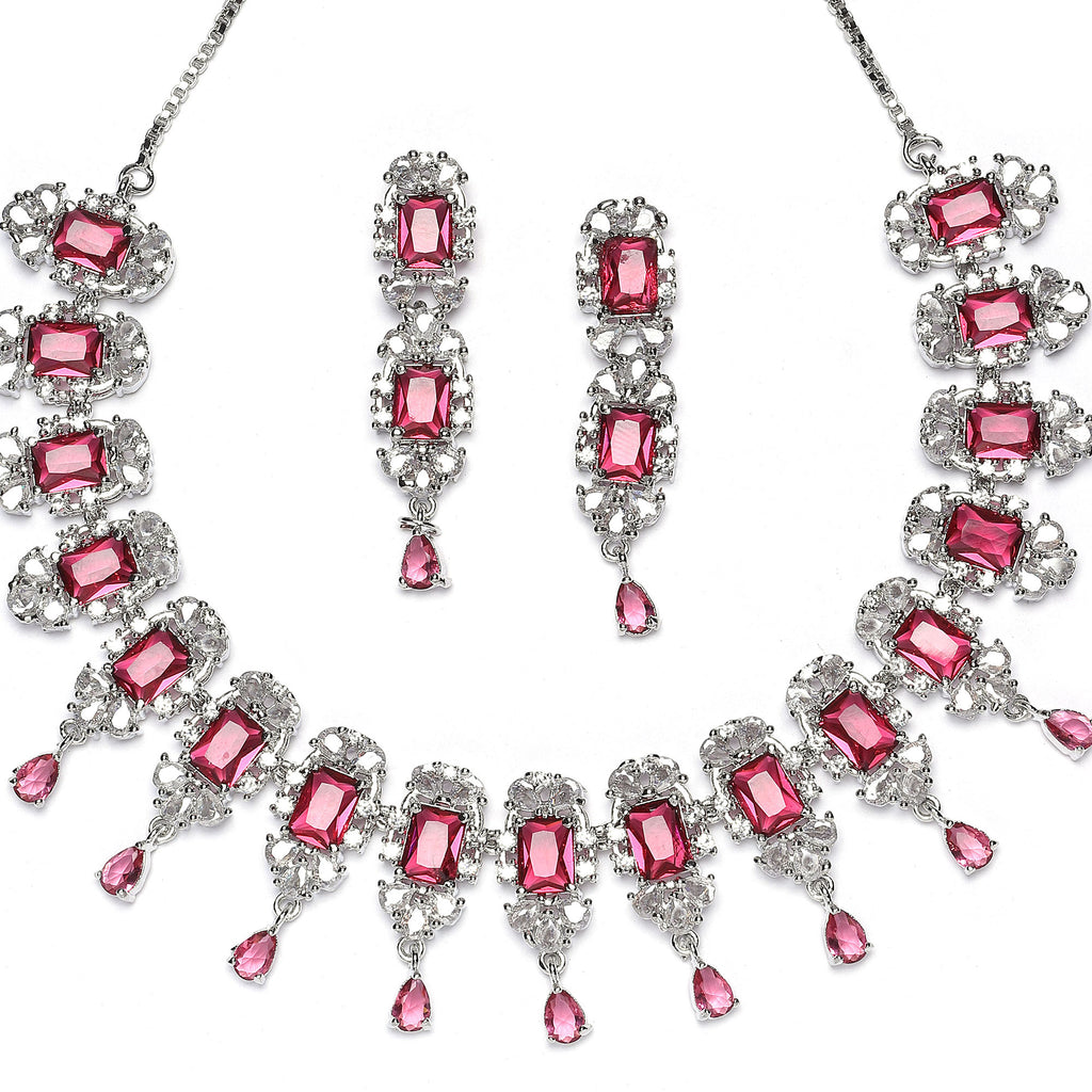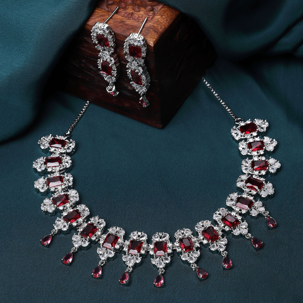 Rhodium-Plated Red American Diamonds Studded Teardrop & Cubical Necklace & Earrings Jewellery Set