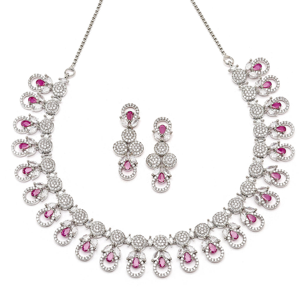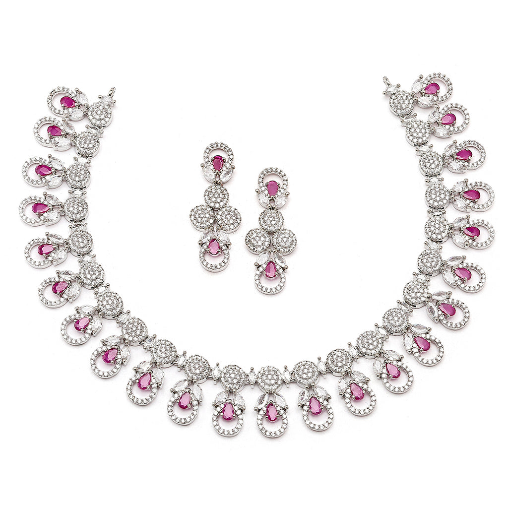 Rhodium-Plated Red American Diamonds Studded Voguish Necklace & Earrings Jewellery Set