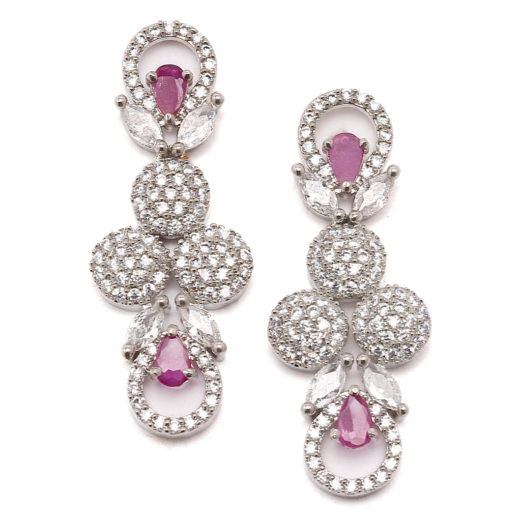 This jewellery set consists of a necklace and a pair of earrings. Rhodium-Plated red & white american diamond studded voguish necklace, secured with hook closure. A pair of matching drop earrings, each secured with a post and back closure.