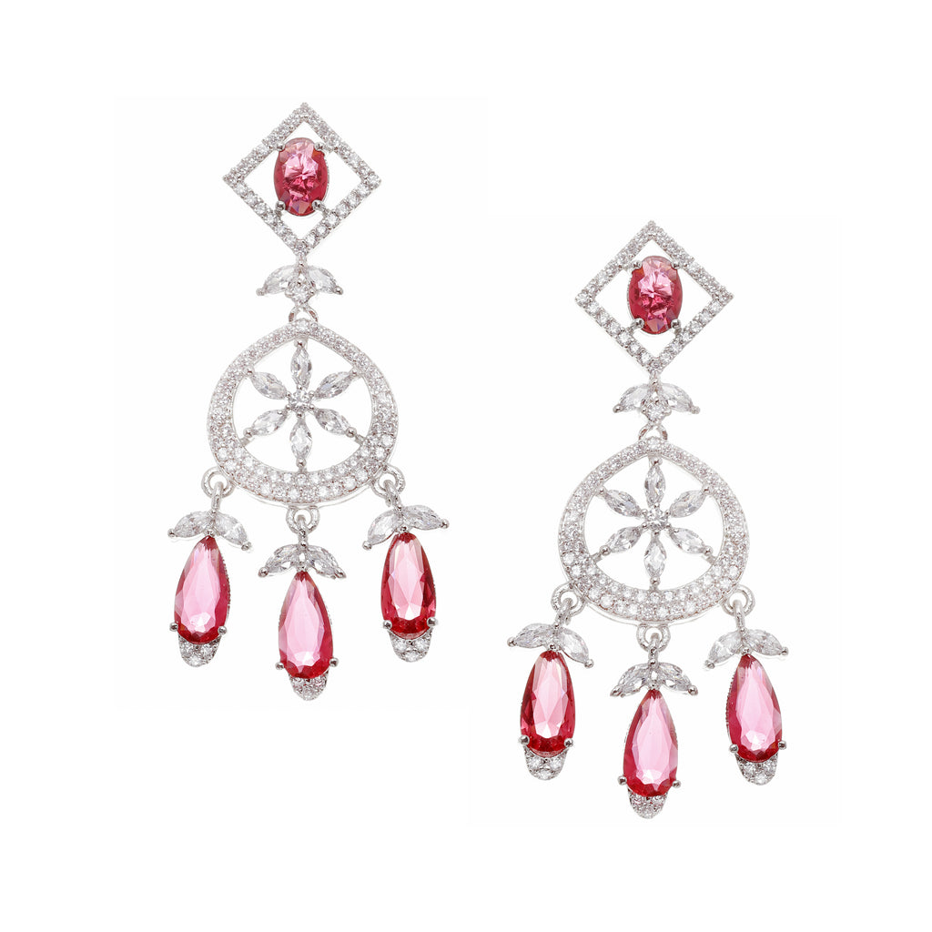 This jewellery set consists of a necklace and a pair of earrings. Rhodium-Plated red & white baguette teardrops american diamond studded necklace, secured with hook closure. A pair of matching drop earrings, each secured with a post and back closure.