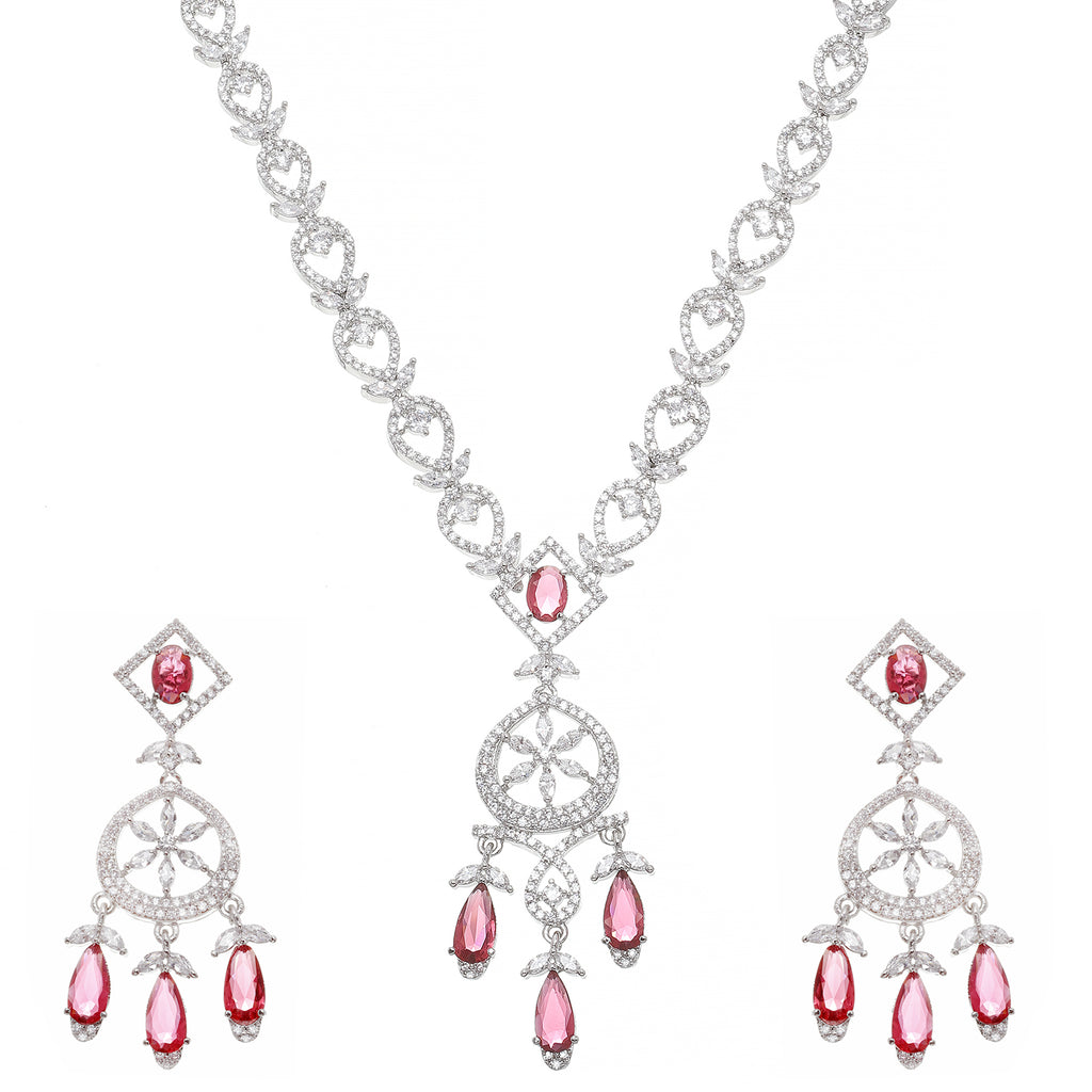 Rhodium-Plated Red Baguette Teardrops American Diamonds Studded Necklace & Earrings Jewellery Set
