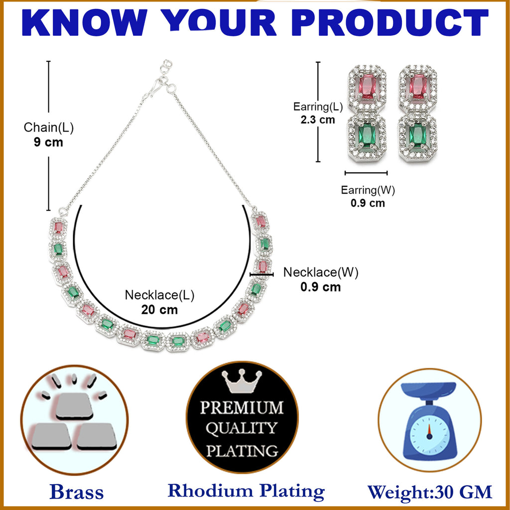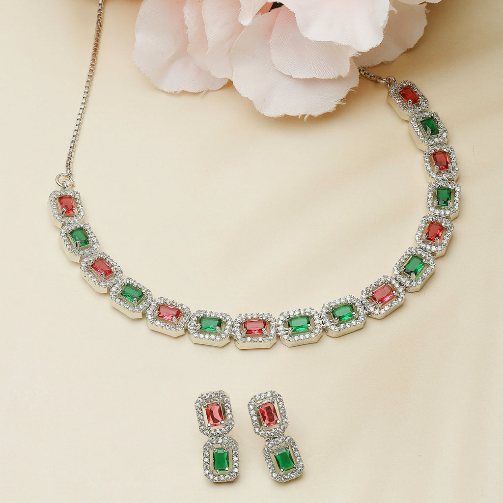 Rhodium-Plated Red & Green American Diamonds Studded Quadrate Shaped Necklace & Earrings Jewellery Set