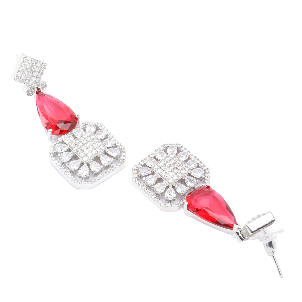 Rhodium-Plated Red & White American Diamond studded Square & Teardrop Drop Earrings