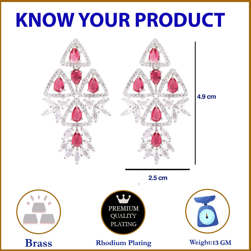 Rhodium-Plated Red & White Triangular Shaped Drop Earrings, has American Diamond studded secured with a post and back.