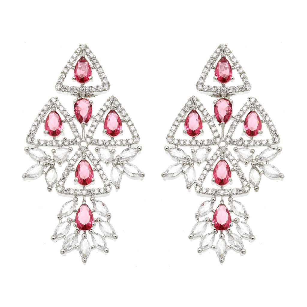 Rhodium-Plated Red & White American Diamond studded Triangular Shaped Drop Earrings