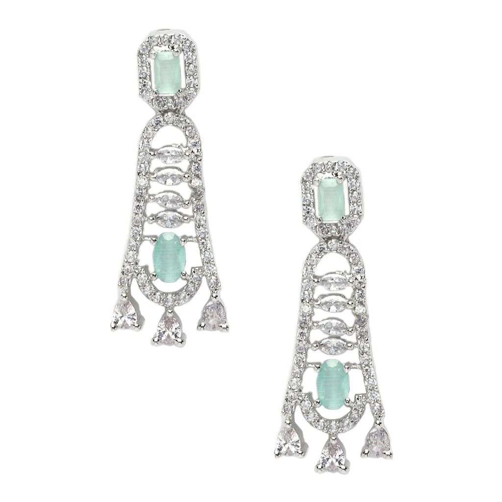 Rhodium-Plated Sea Green American Diamond studded Classic Contemporary Drop Earrings