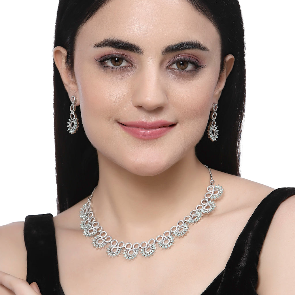 Rhodium-Plated Sea Green American Diamond Studded Classic Necklace with Earrings Jewellery Set
