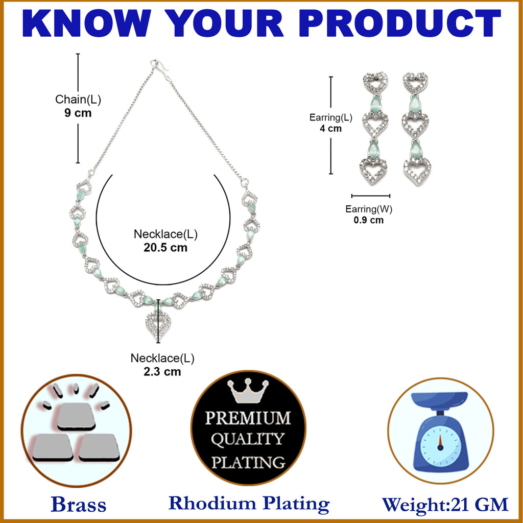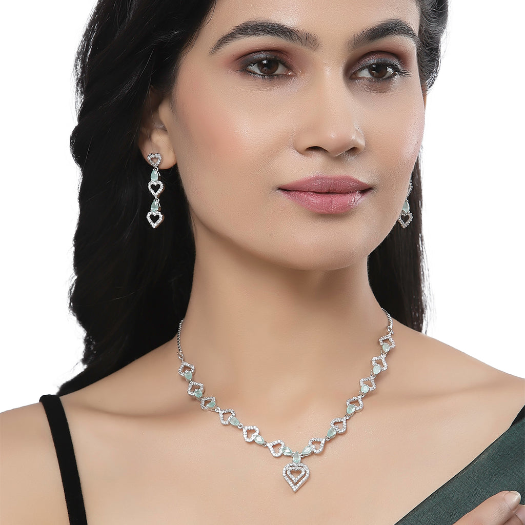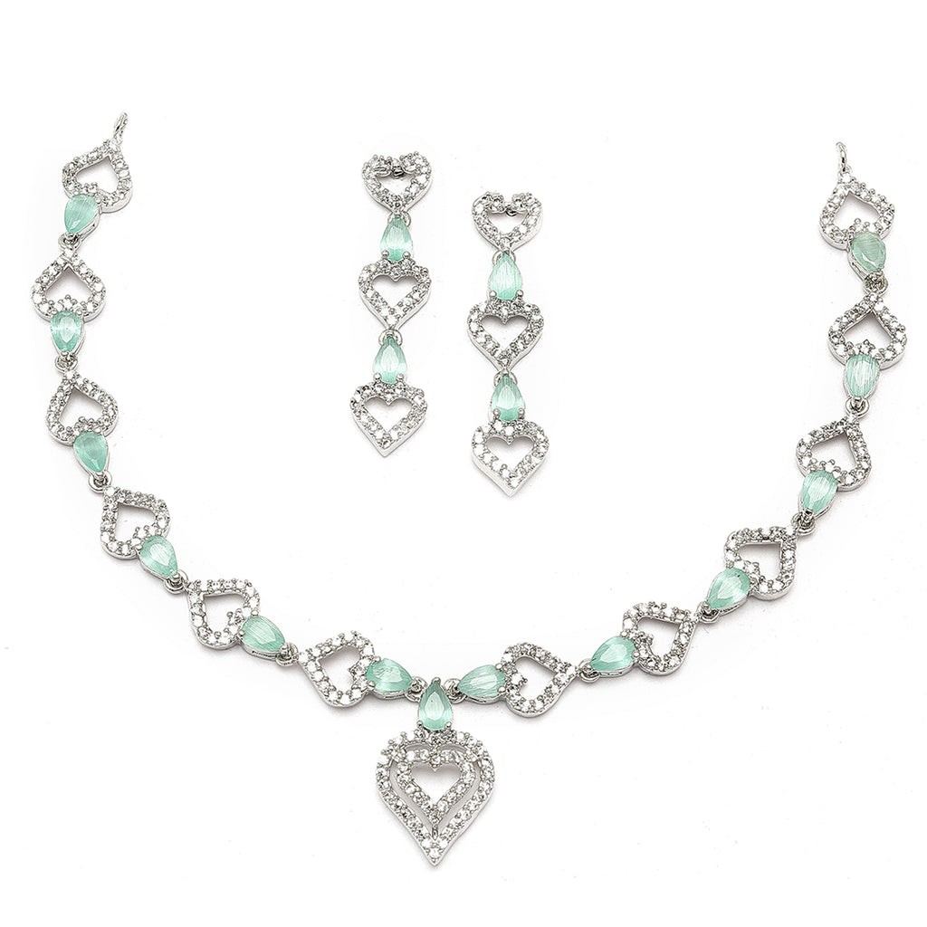 Rhodium-Plated Sea Green American Diamond Studded Heart Design Necklace & Earrings Jewellery Set